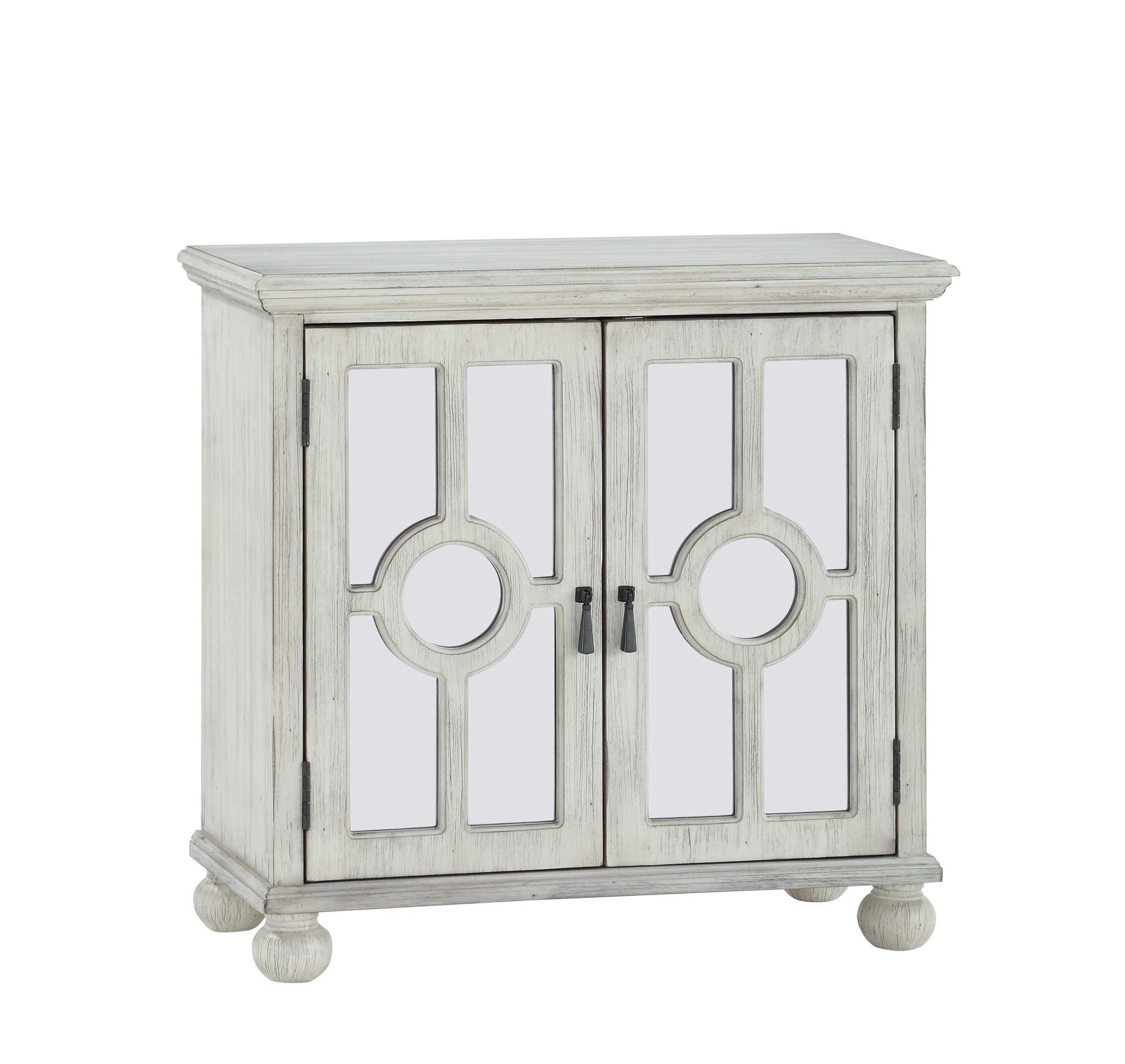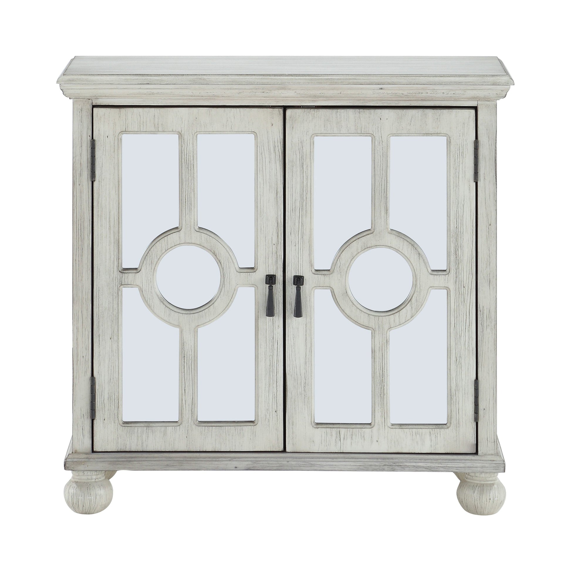 The Poppy Collection provides classic accent to your home’s décor while meeting your storage needs. The modern traditional design of the cabinet features behind door shelving, turned support feet, antique white finish, circular themed decorative mixed-media glass and wood doors, and antiqued brass hardware. Also available in black and aqua finish.