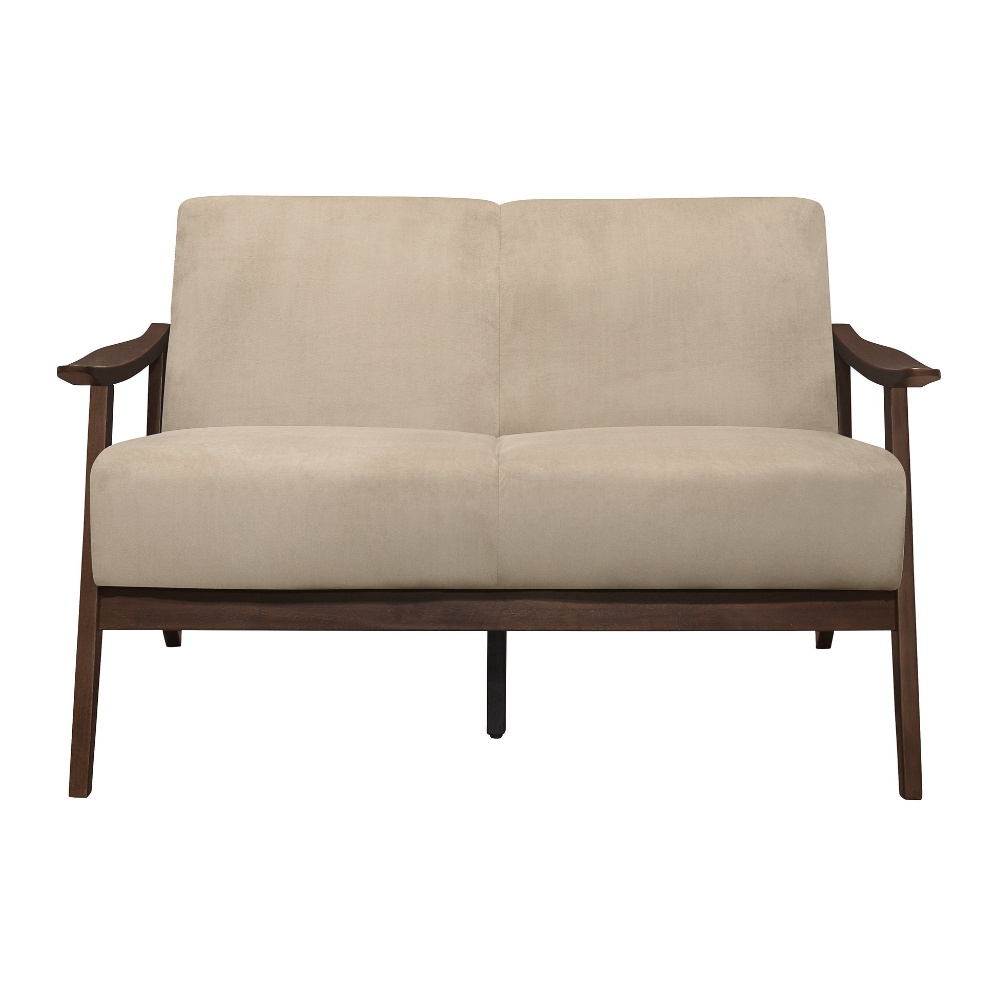 The frame of the Carlson Collection recalls a time when simplicity of profile was the height of style. The streamlined design of the love seat's subtly sloped wood arms and legs is finished in dark walnut which serves to highlight the light brown velvet covering.