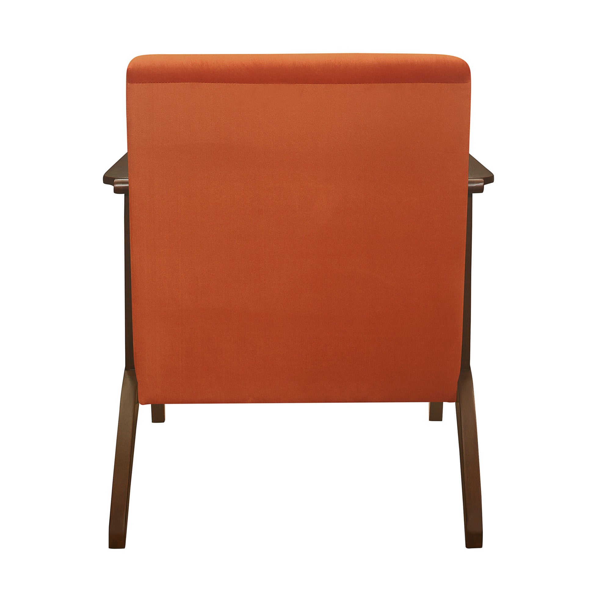 The frame of the Carlson Collection recalls a time when simplicity of profile was the height of style. The streamlined design of the chair's subtly sloped wood arms and legs is finished in dark walnut which serves to highlight the orange velvet covering.