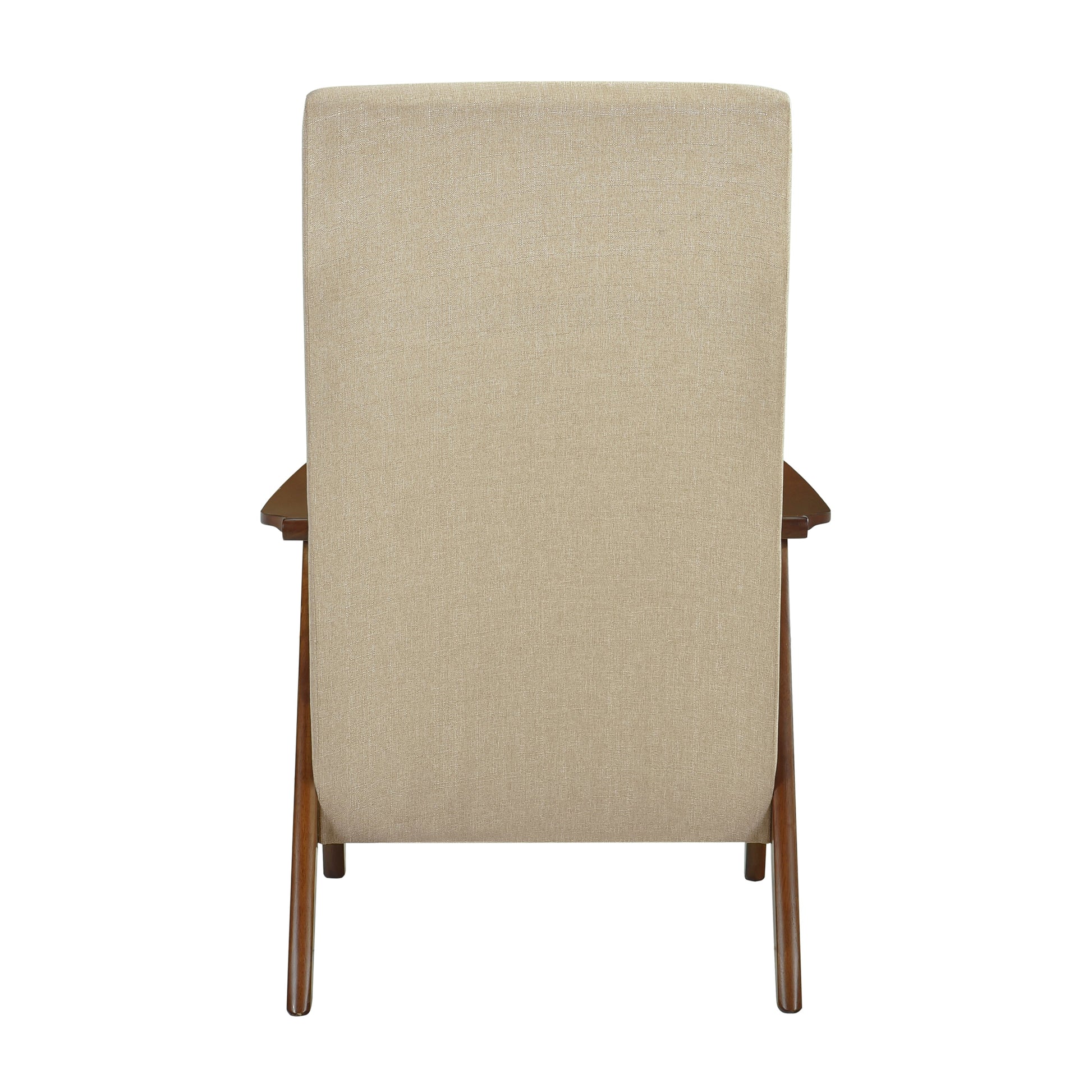 The frame of the Kalmar Collection recalls a time when simplicity of profile was the height of style. The understated design of the high-back chair's subtly sloped wood arms and legs is finished in walnut, with its seating covered in a brown linen-like textured fabric upholstery.