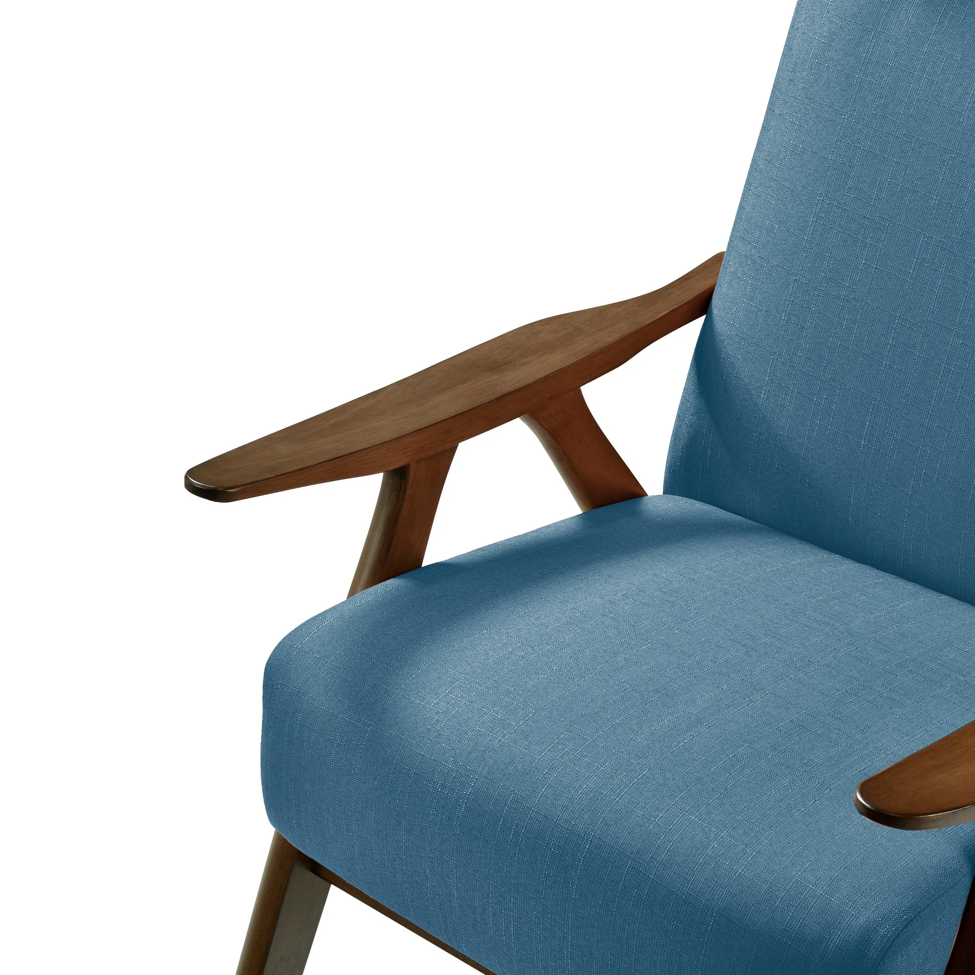The frame of the Kalmar Collection recalls a time when simplicity of profile was the height of style. The understated design of the high-back chair's subtly sloped wood arms and legs is finished in walnut, with its seating covered in a blue linen-like textured fabric upholstery.