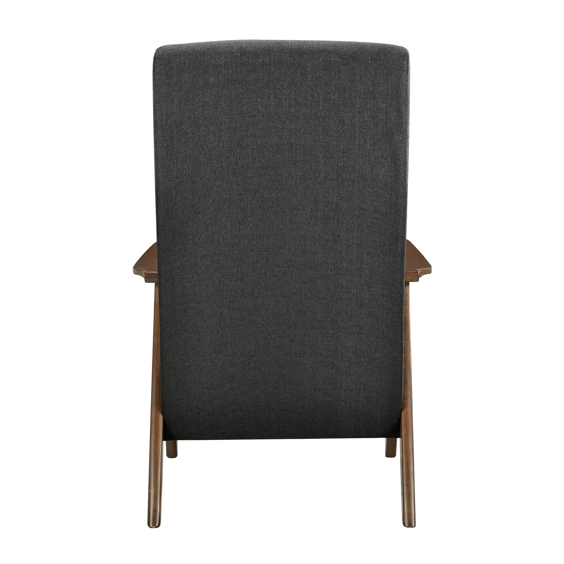 The frame of the Kalmar Collection recalls a time when simplicity of profile was the height of style. The understated design of the high-back chair's subtly sloped wood arms and legs is finished in walnut, with its seating covered in a dark gray linen-like textured fabric upholstery.