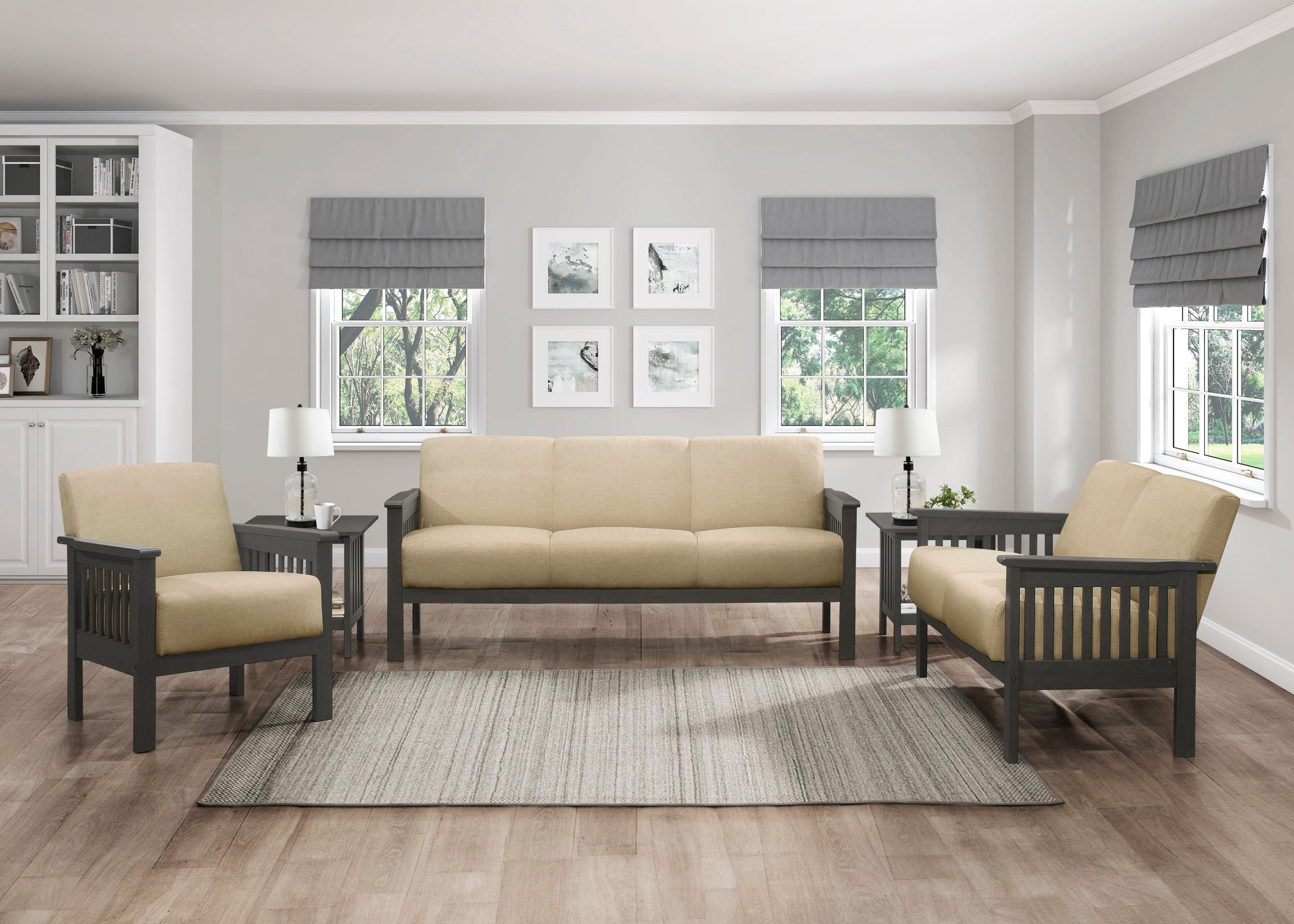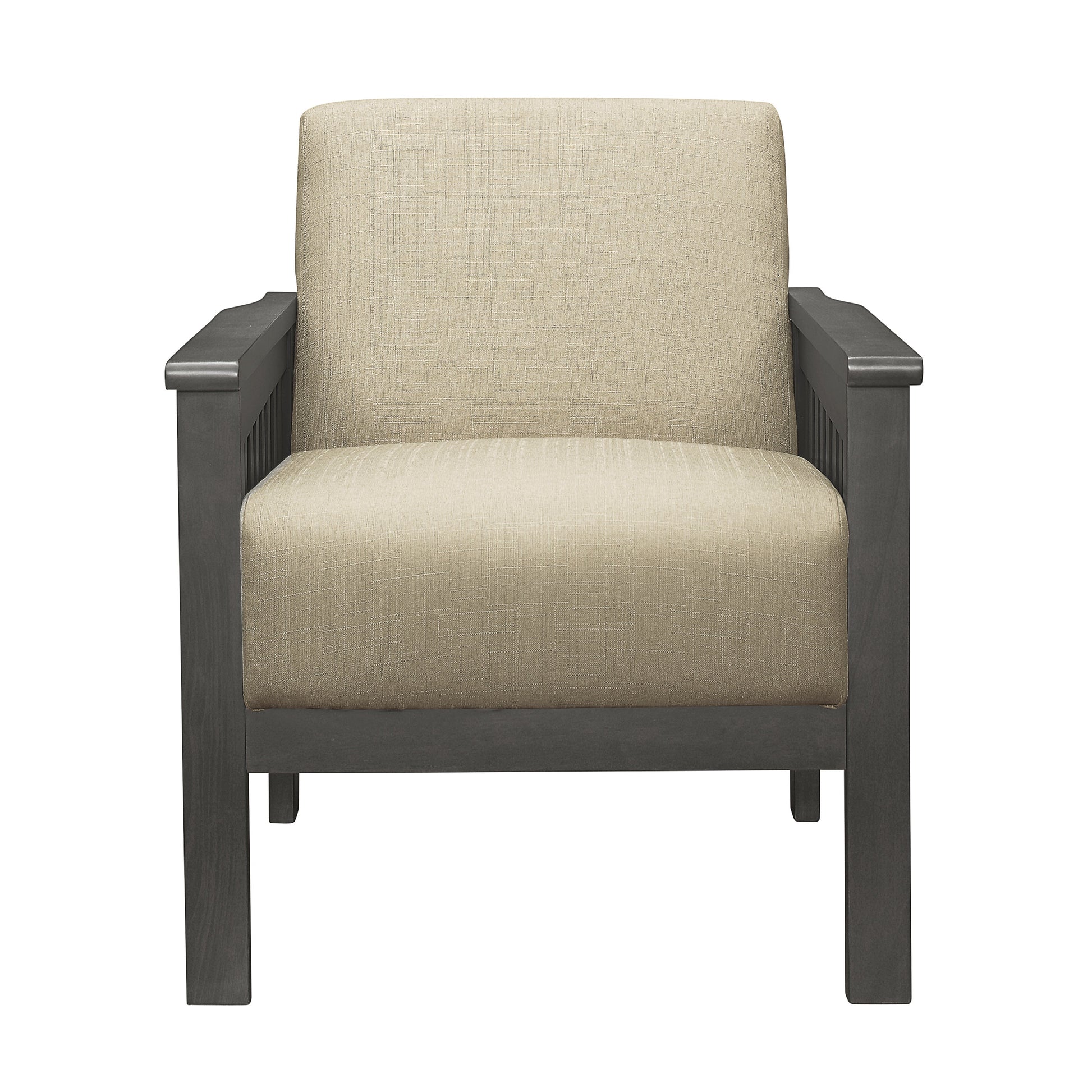 Designed with inspiration from the Arts & Crafts movement, the Lewiston Collection will be a classic addition to your home’s décor. The chair's transitionally styled legs and vertical slat-supported wood arms are finished in an antique gray, providing complementing contrast to the brown linen-like fabric covering.