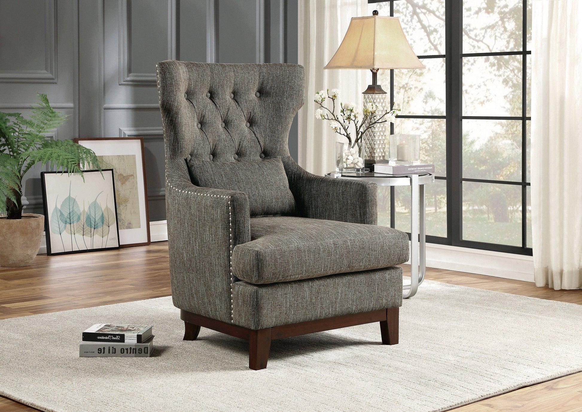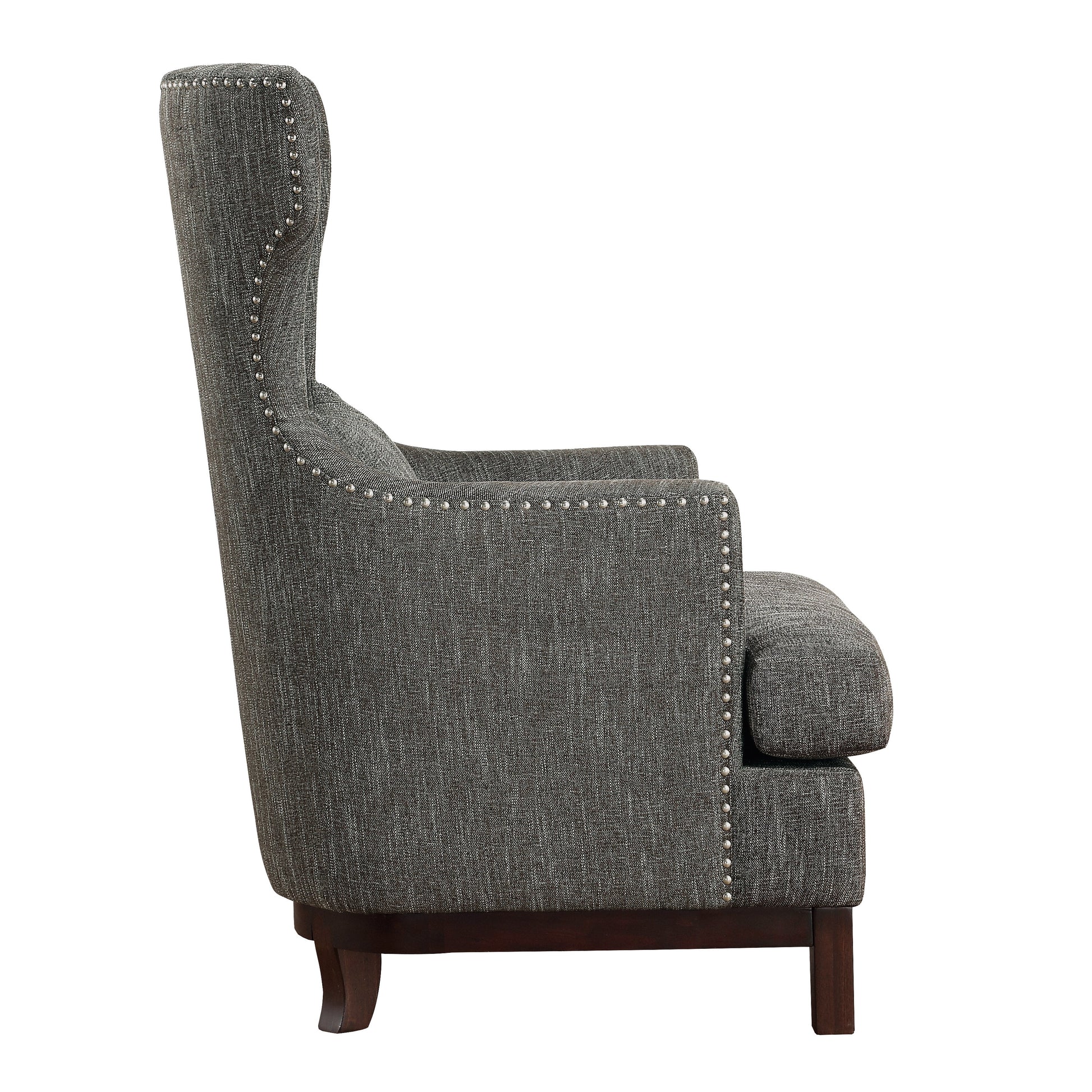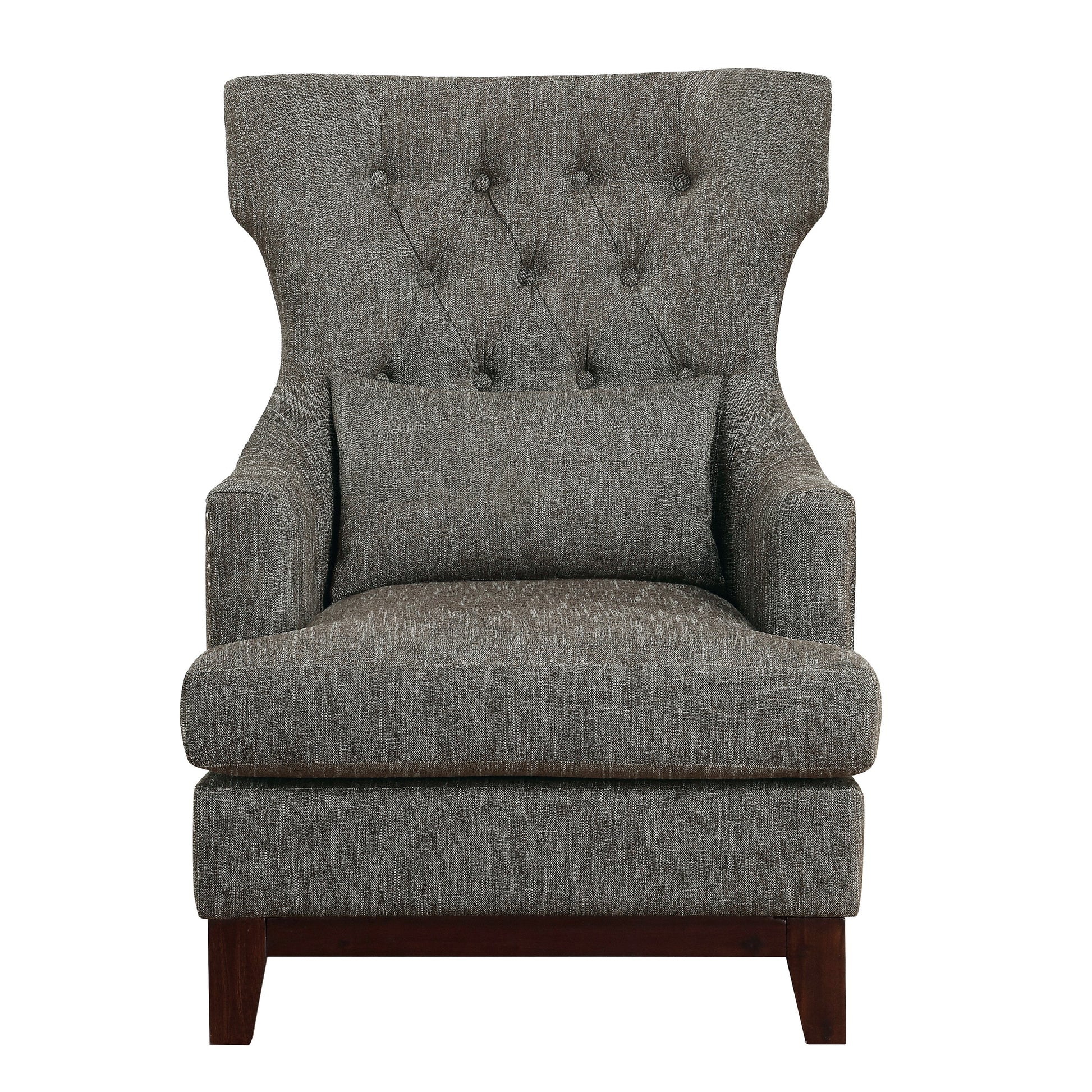 The visual and textural statement of the elegant Adriano Collection lends distinct accent to your home’s decor. Wing-backed, as a nod to traditional form, and covered in woven brown-gray fabric, the chair features nailhead accent and button-tufting further enhancing the tailored styling.