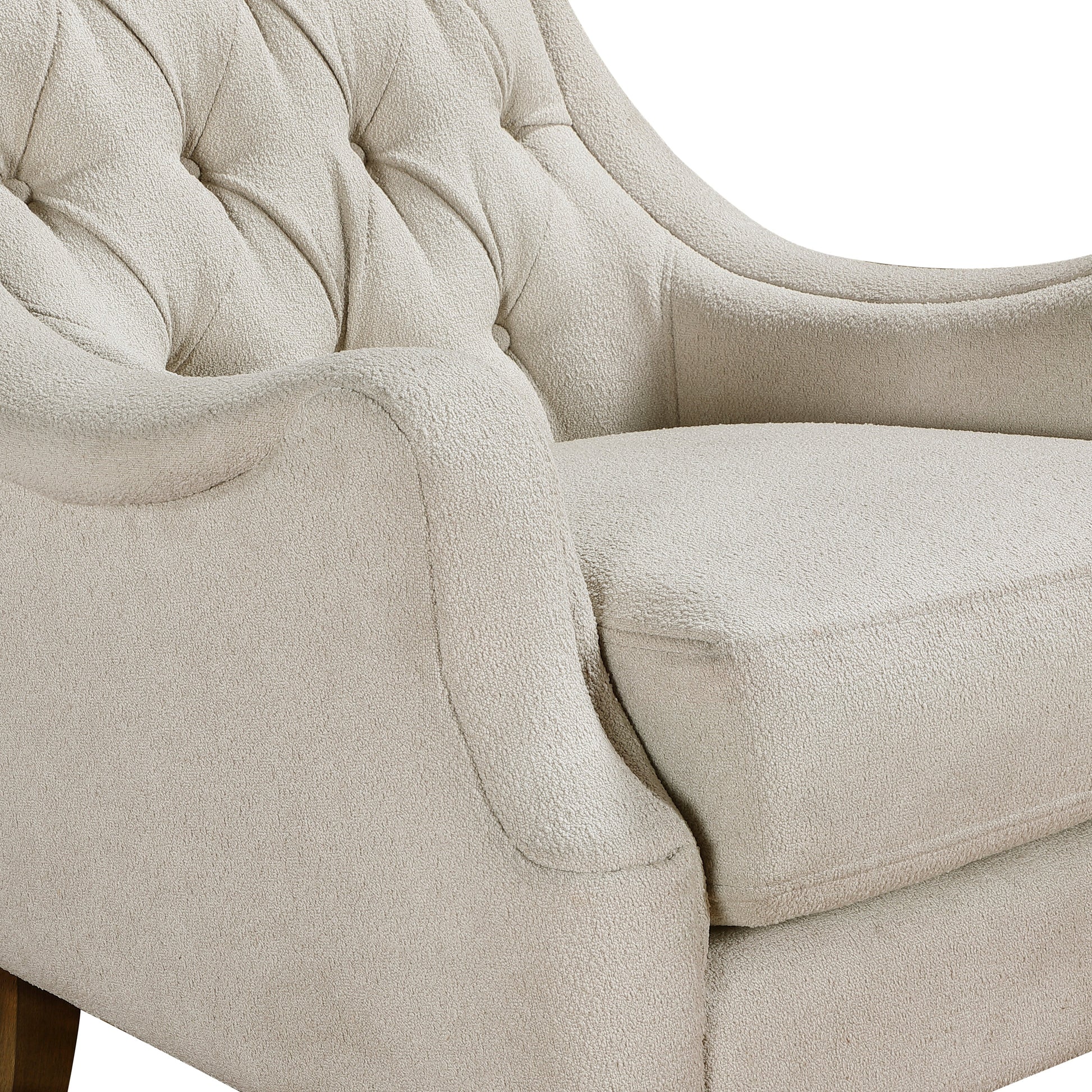 With a look that encompasses the refined accenting of traditional design and a tailored profile that has hints of modern styling, the Stella Collection is an elegant addition to your home’s décor. Dark brown finished solid wood legs provide support to the subtle curves of the chair’s frame, while providing contrast to the beige boucle upholstered fabric. Button tufted detailing solidifies the classic look.