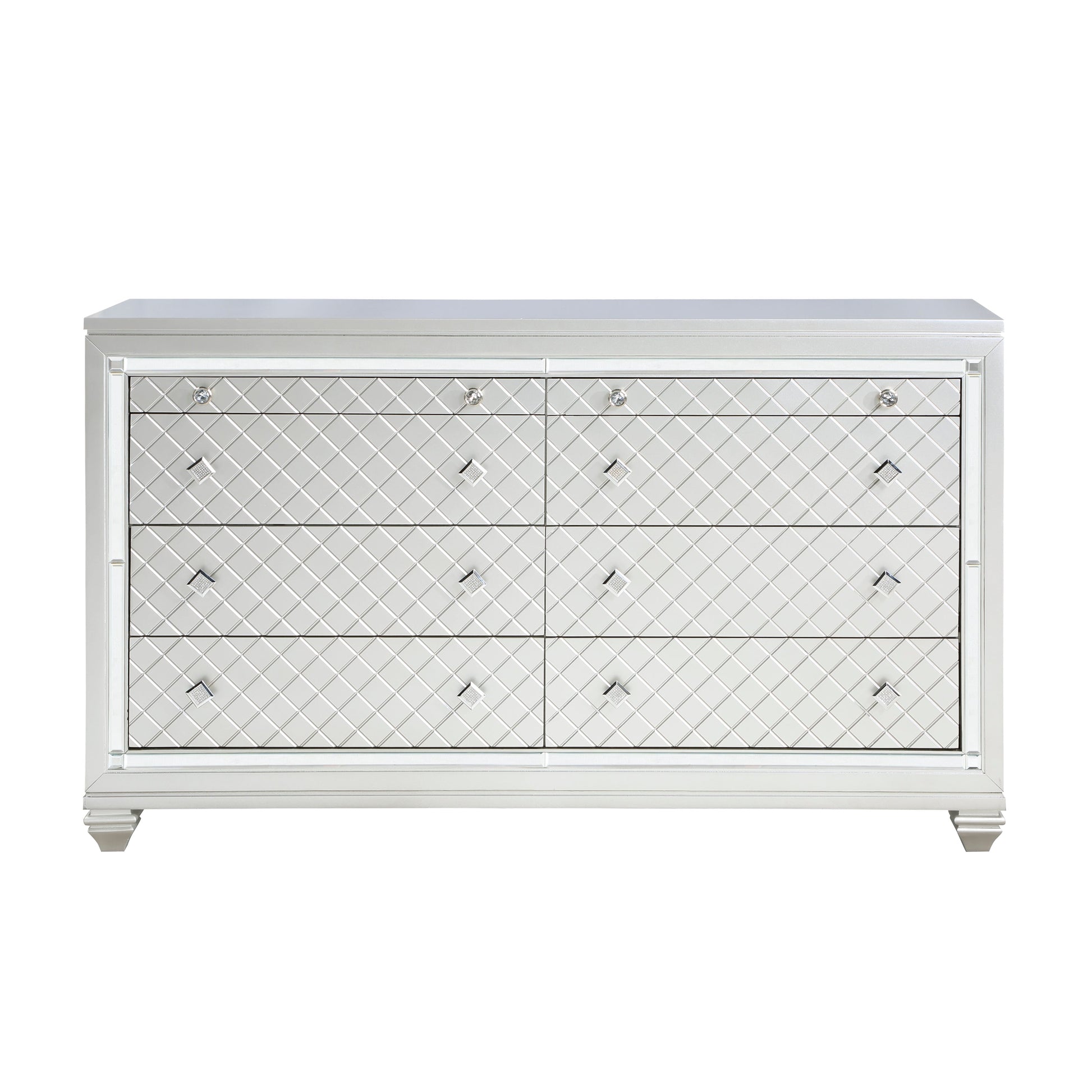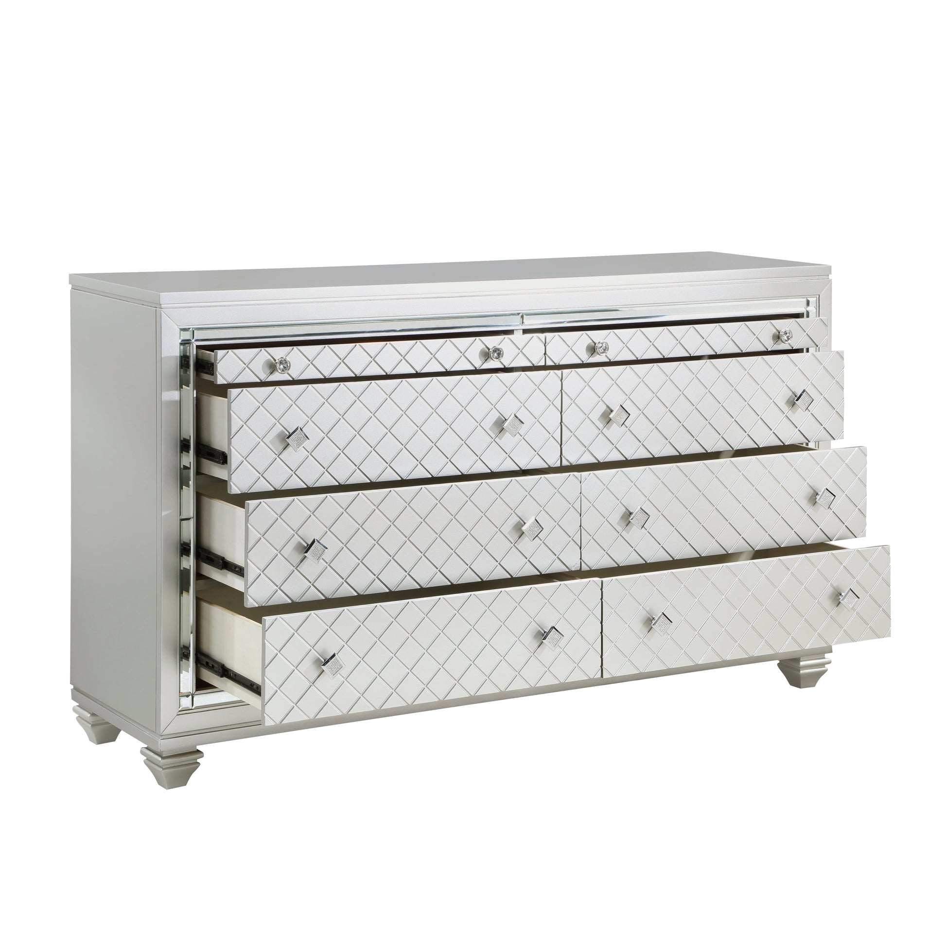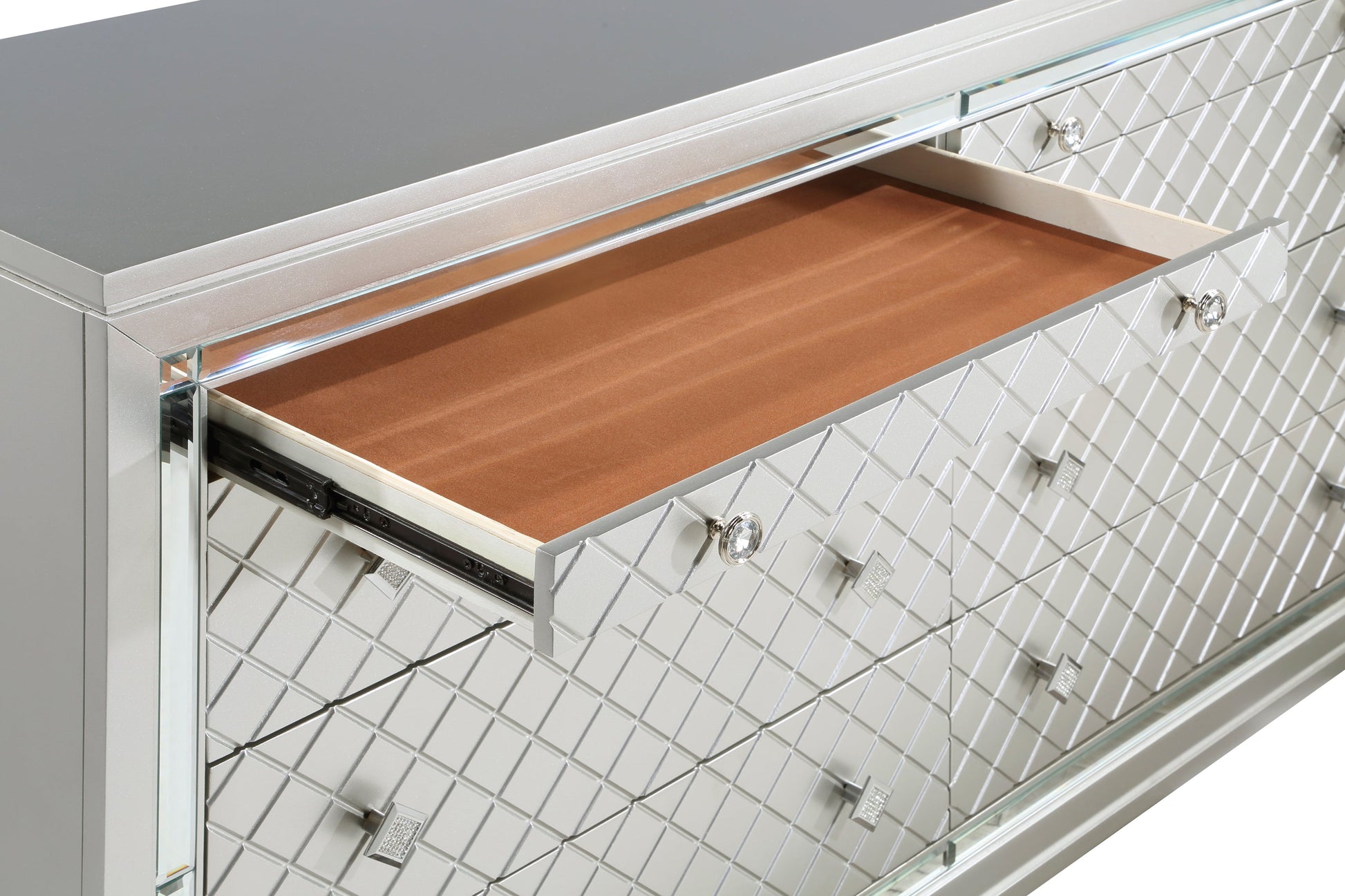 The bold visual presentation of the Leesa Collection complements your glamorous design aspirations. Diamond pattern drawer fronts and hardware, and mirrored framing are featured on the silver-finished dresser, it’s classic styling lending timeless accent to the look of the collection.