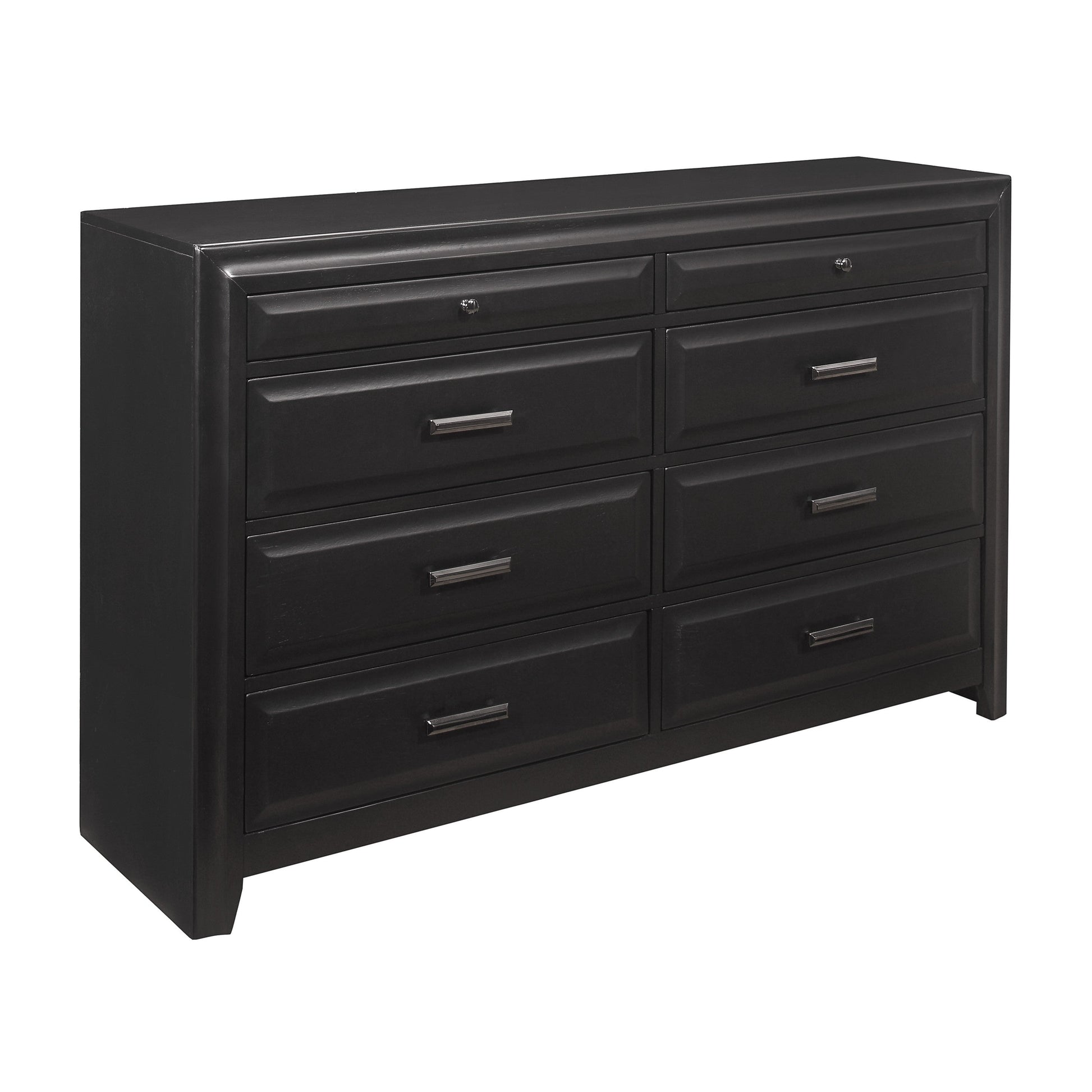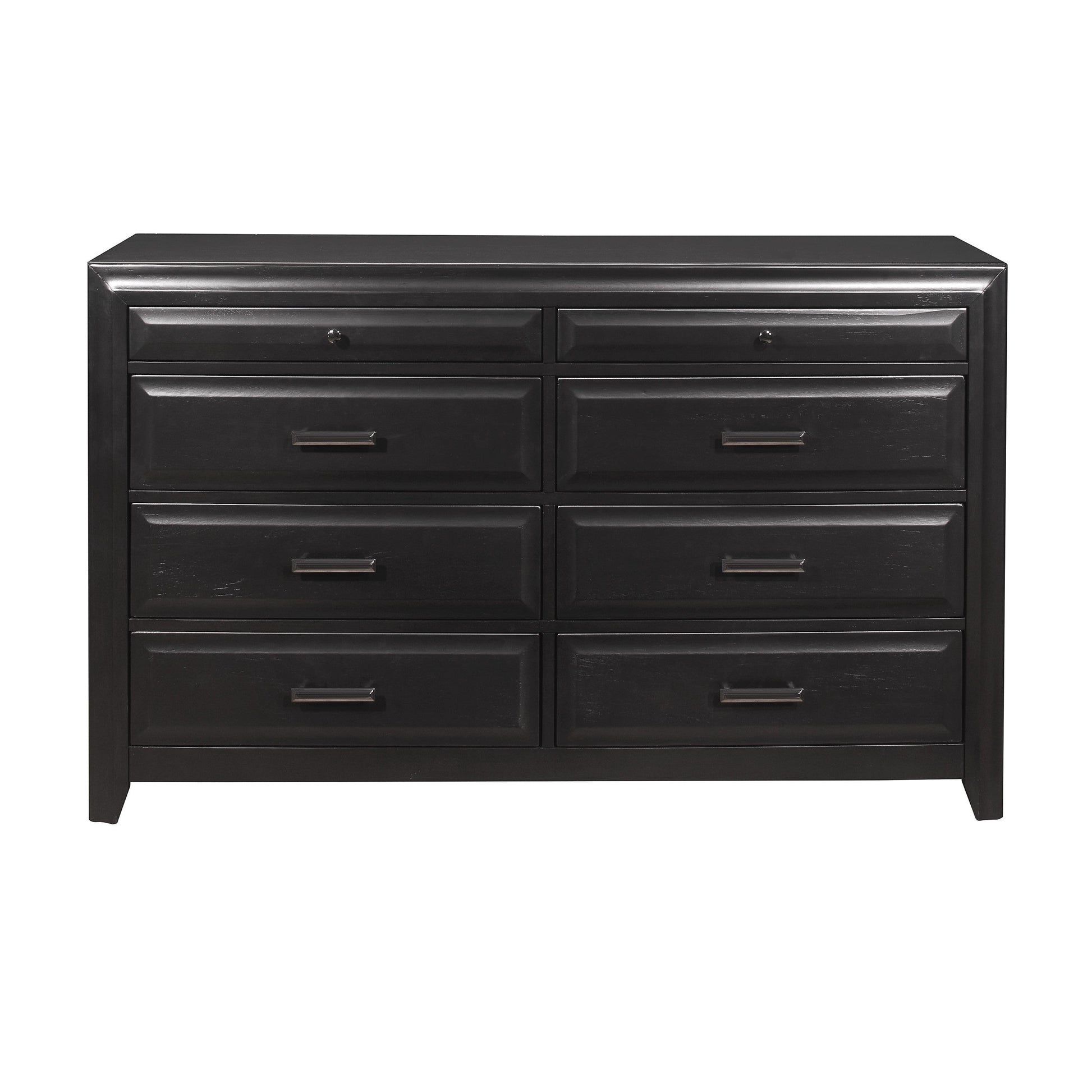 The soft modern styling of the Cordelia Collection creates a look that is a perfect fit for your bedroom. Black bar hardware play subtly against the espresso finish that graces the okume veneer of the dresser.