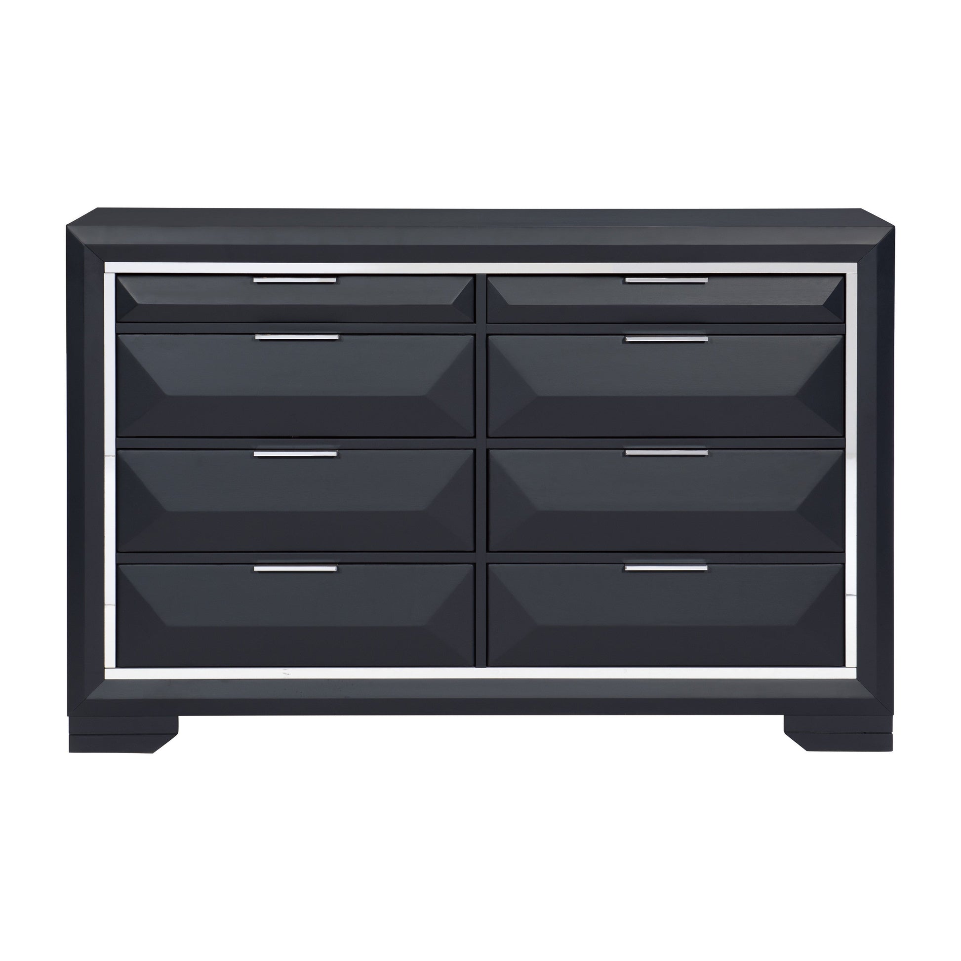 The modern design of the Rosemont Collection creates a striking profile for your bedroom. The midnight blue finish is reflected by the chrome banding that defines the front of the dresser. Chrome pull hardware accents each of the raised drawer fronts.