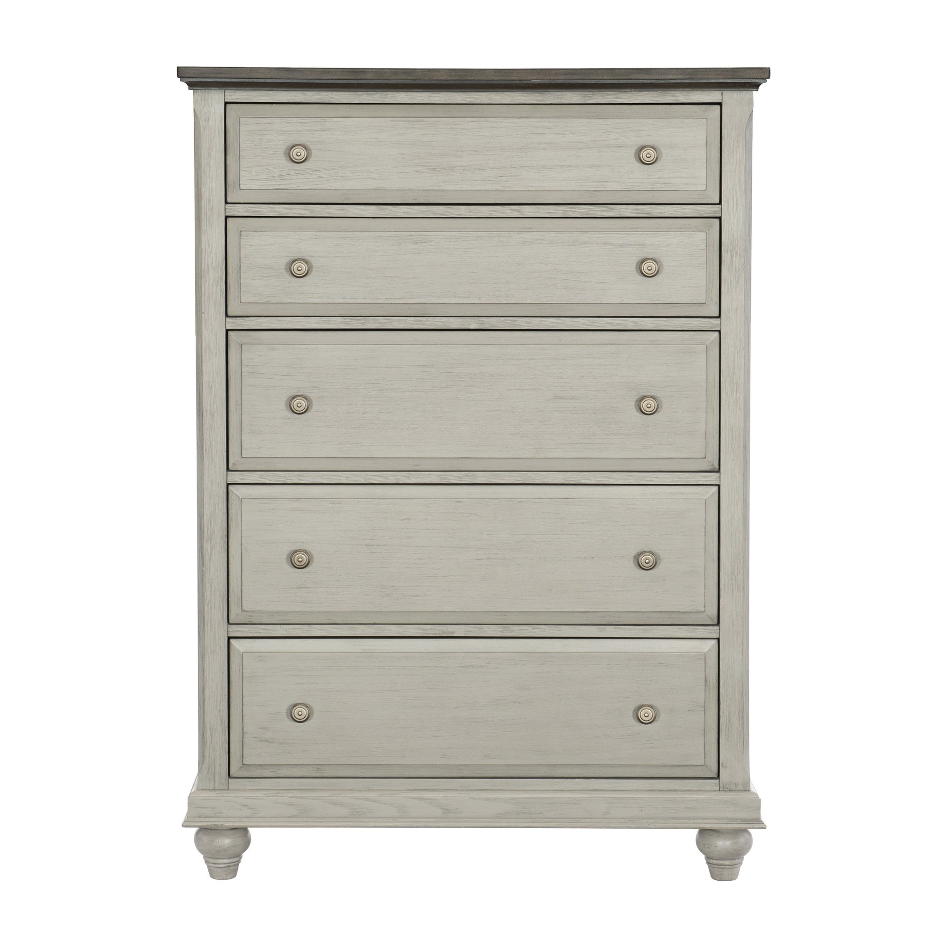 In nod to modern farmhouse design, the Mossbrook Collection features a classic profile that will be a perfect addition to your home’s décor. The pine solids and oak veneer of the collection feature a light gray finish, subtly highlighting the wood’s grain. The dark brown top of the chest provides contrast, as do the antique pewter tone knobs that front the drawers.