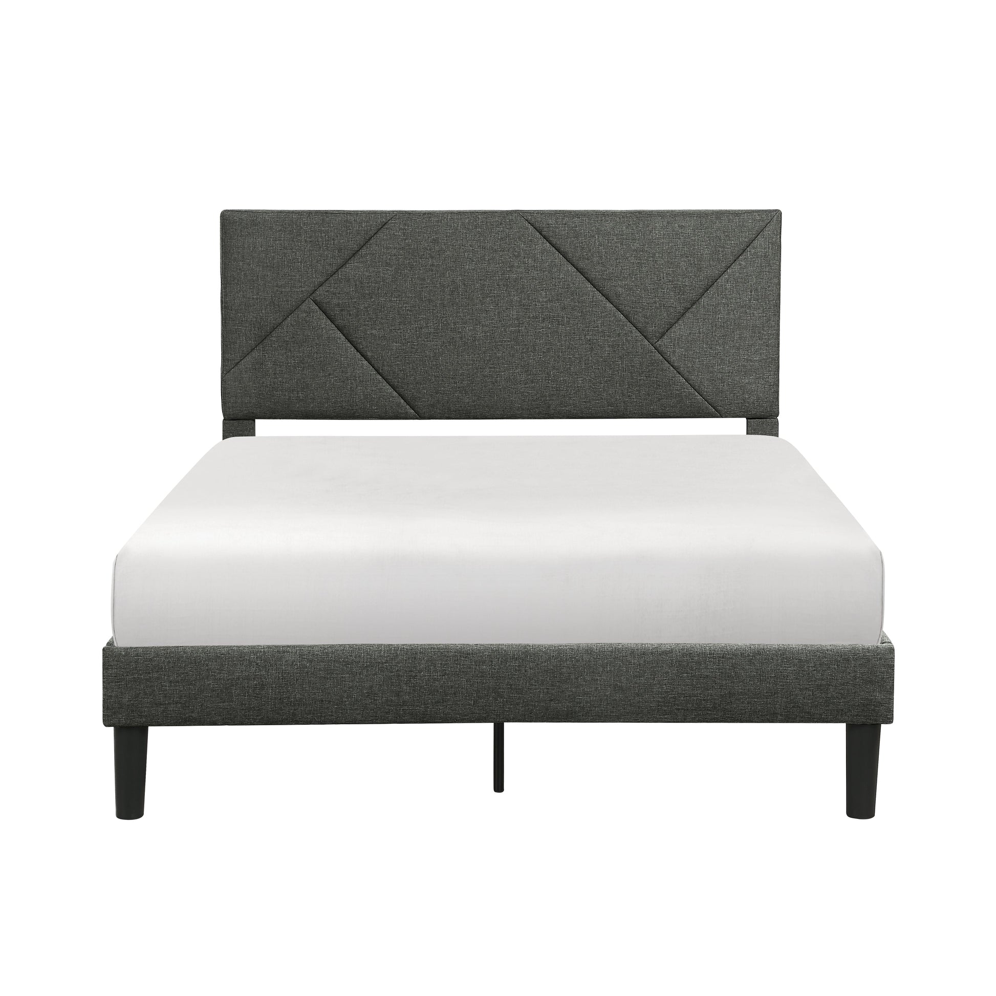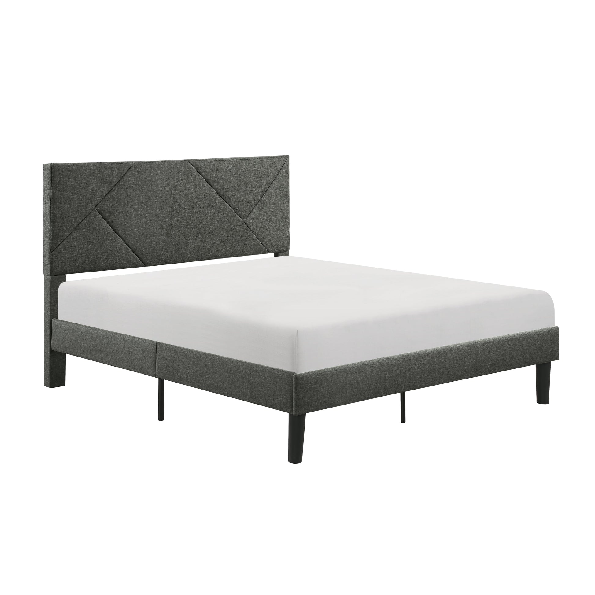Dramatic asymmetrical lines intersect to create the modern look of the Raina Collection. Gray textured fabric upholstery covers the queen frame – Headboard, Footboard and Rails – allowing for its neutral hue to act as a canvas for your decorative styling. Convenience comes in the form of its packaging, with all components arriving in one box.