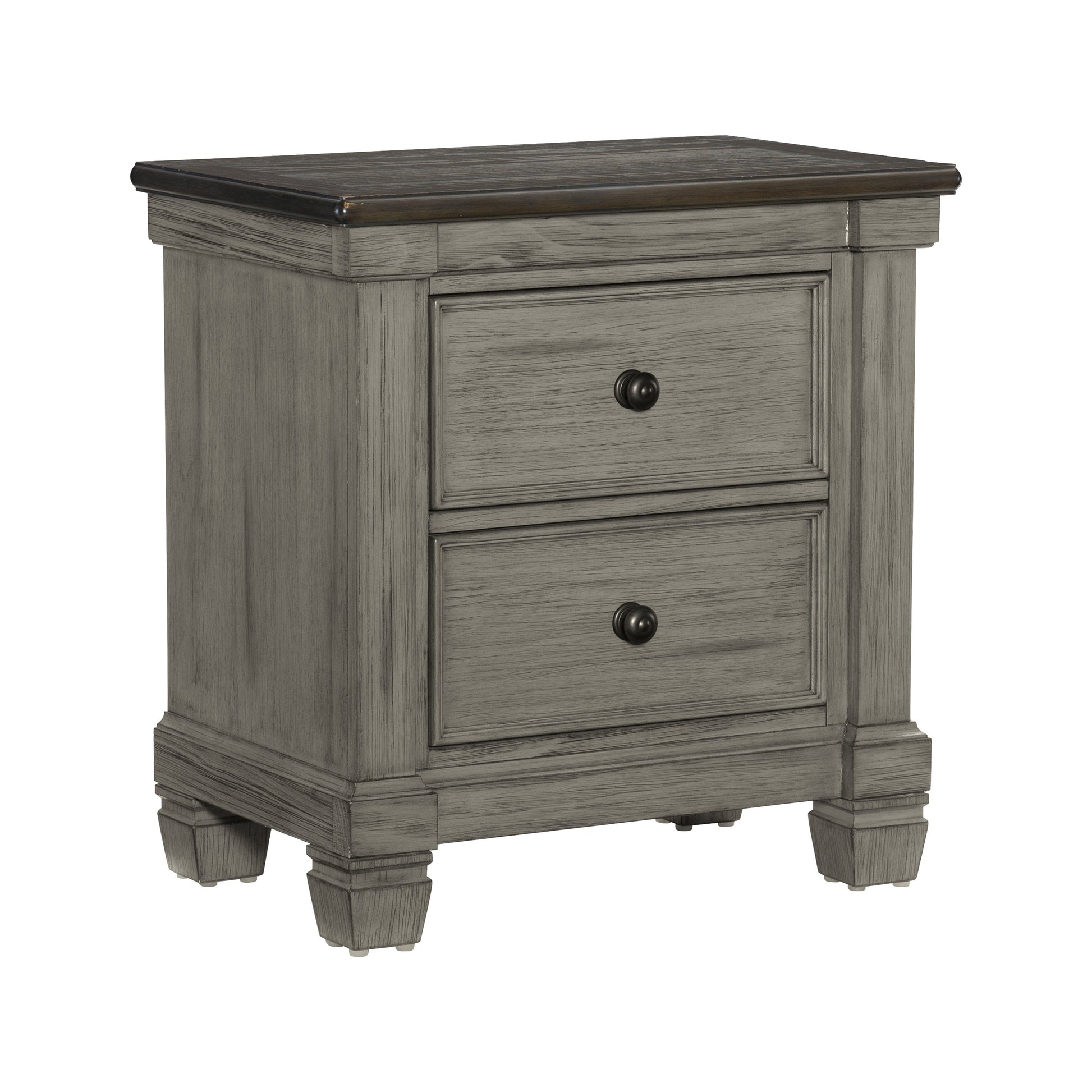 Transitional-rustic styling is expertly achieved in the design of the Weaver Collection. Antique gray provides bold contrast to the coffee-hued plank-style top of the nightstand, with pine solids and oak veneer further lending visual texture. Classic framing paired with dark metal knob hardware complete the rustic look.
