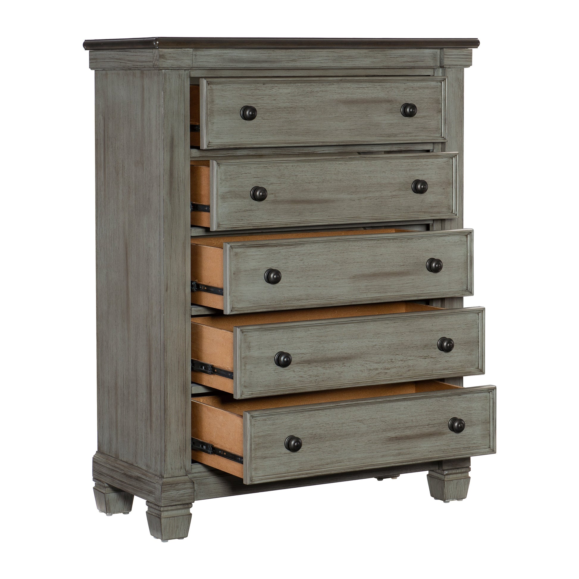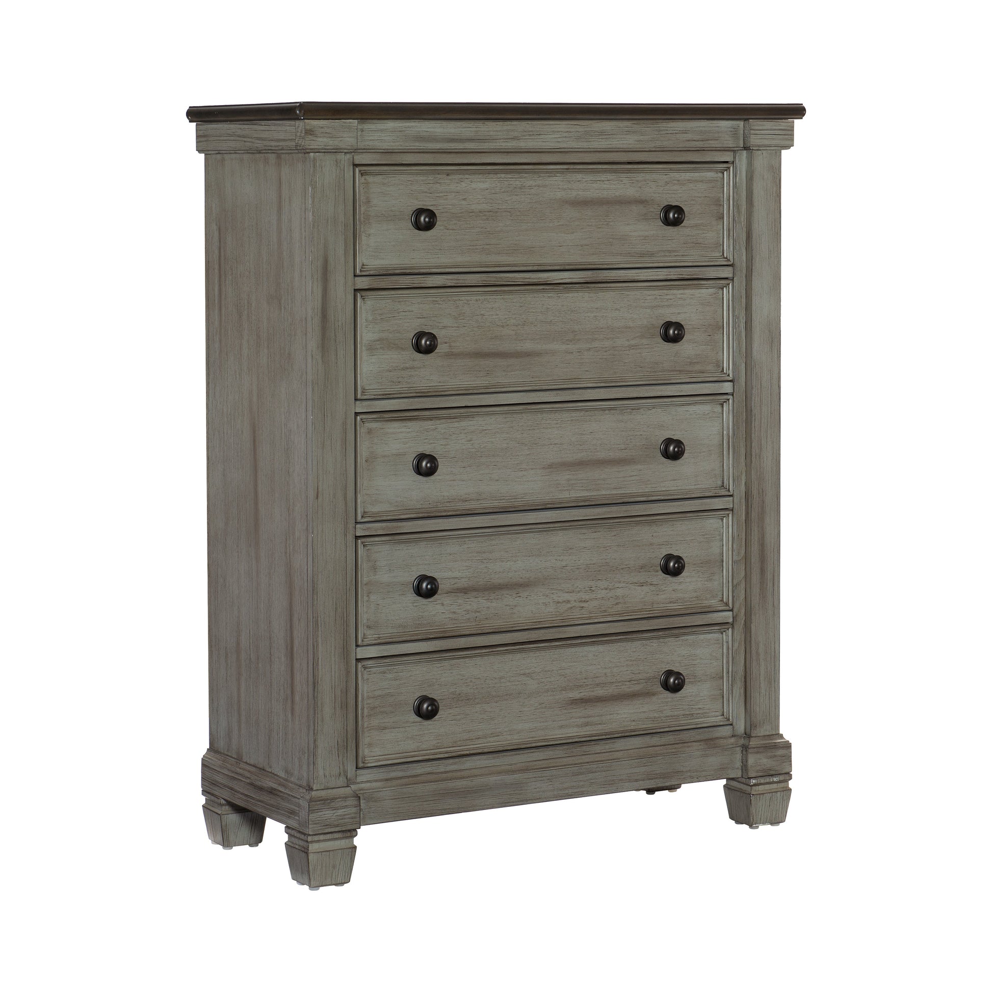 Transitional-rustic styling is expertly achieved in the design of the Weaver Collection. Antique gray provides bold contrast to the coffee-hued plank-style top of the chest, with pine solids and oak veneer further lending visual texture. Classic framing paired with dark metal knob hardware complete the rustic look.