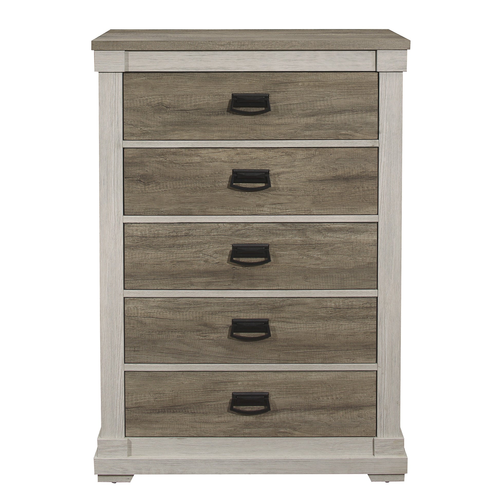 Designed for your transitionally styled bedroom is the Arcadia Collection. The two-tone look of the group is achieved with white framing and variegated gray printed faux-wood grain veneer. Dark hardware lends visual contrast to the classic shape of the chest.