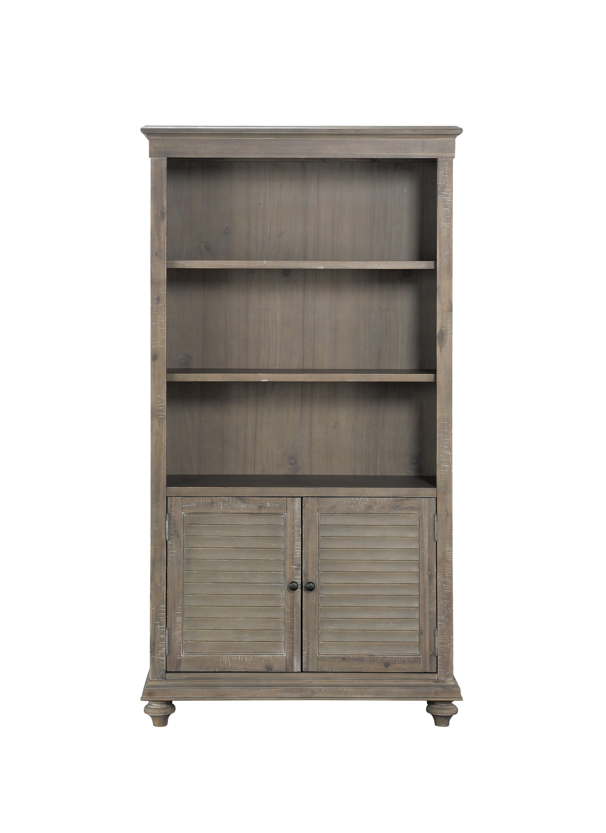 The solid transitional styling of the Cardano Collection creates an impactful design presence in your home. Utilizing distinct accent techniques – plank effect, rasping, saw marks – and pairing them with traditional framing and a rich finish – light brown driftwood over acacia veneers – creates a bookcase that is worthy of your home. Pewter-finished hardware, mounted on the functional doors, provides a subtle contrast to the wood’s light finish.