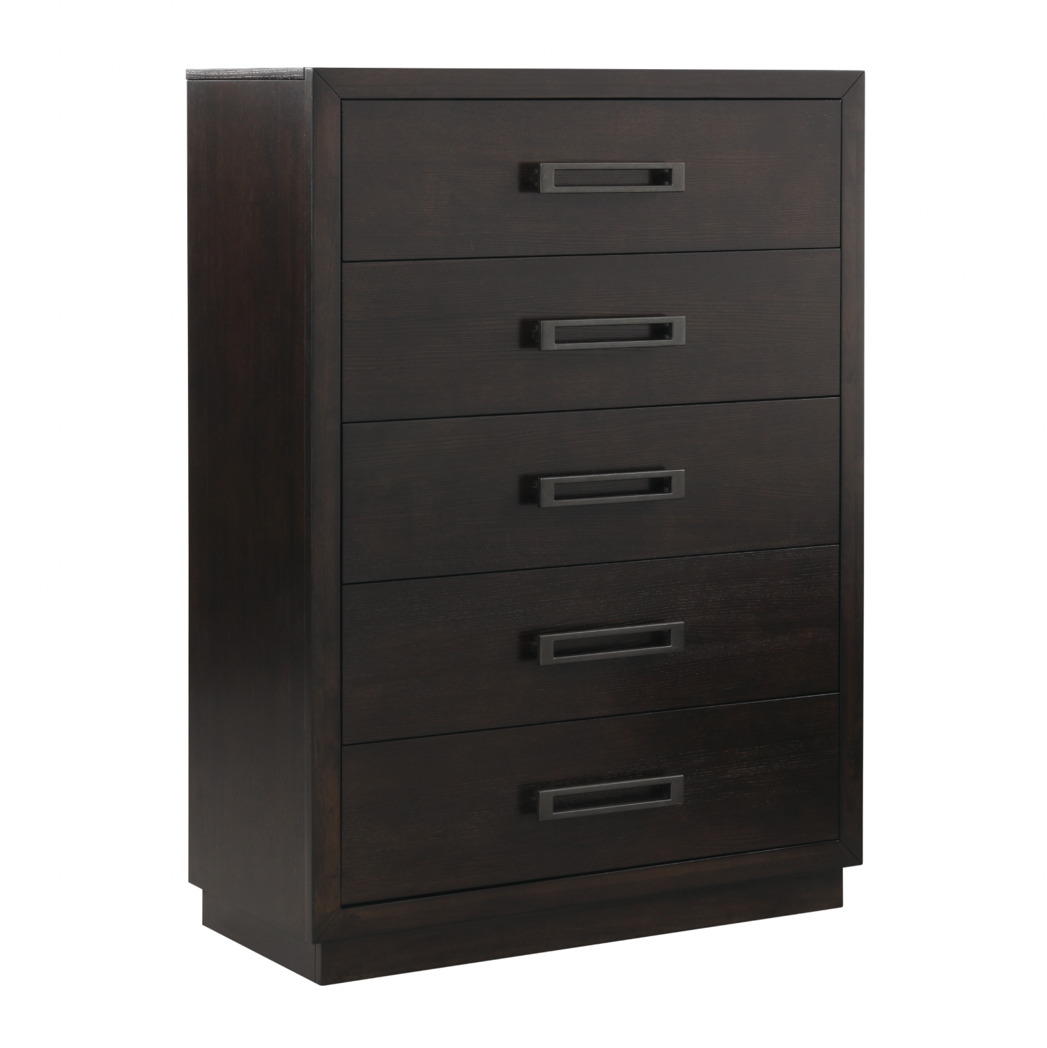 The striking profile of the Larchmont Collection is an intersection of texture, material and style. Prominent horizontal metal hardware is mounted on each drawer front, and is finished to complement the tone of the charcoal finish over ash veneer.