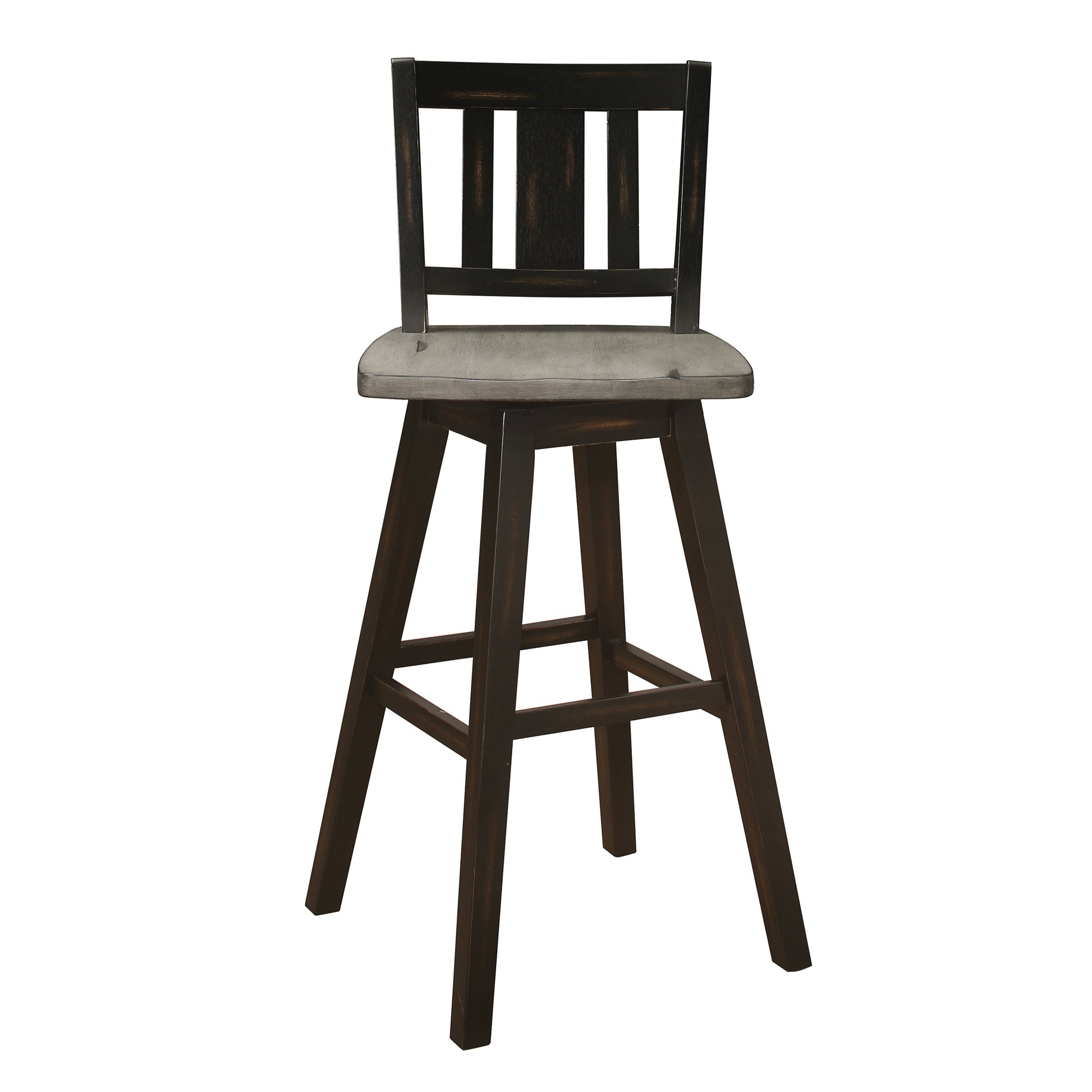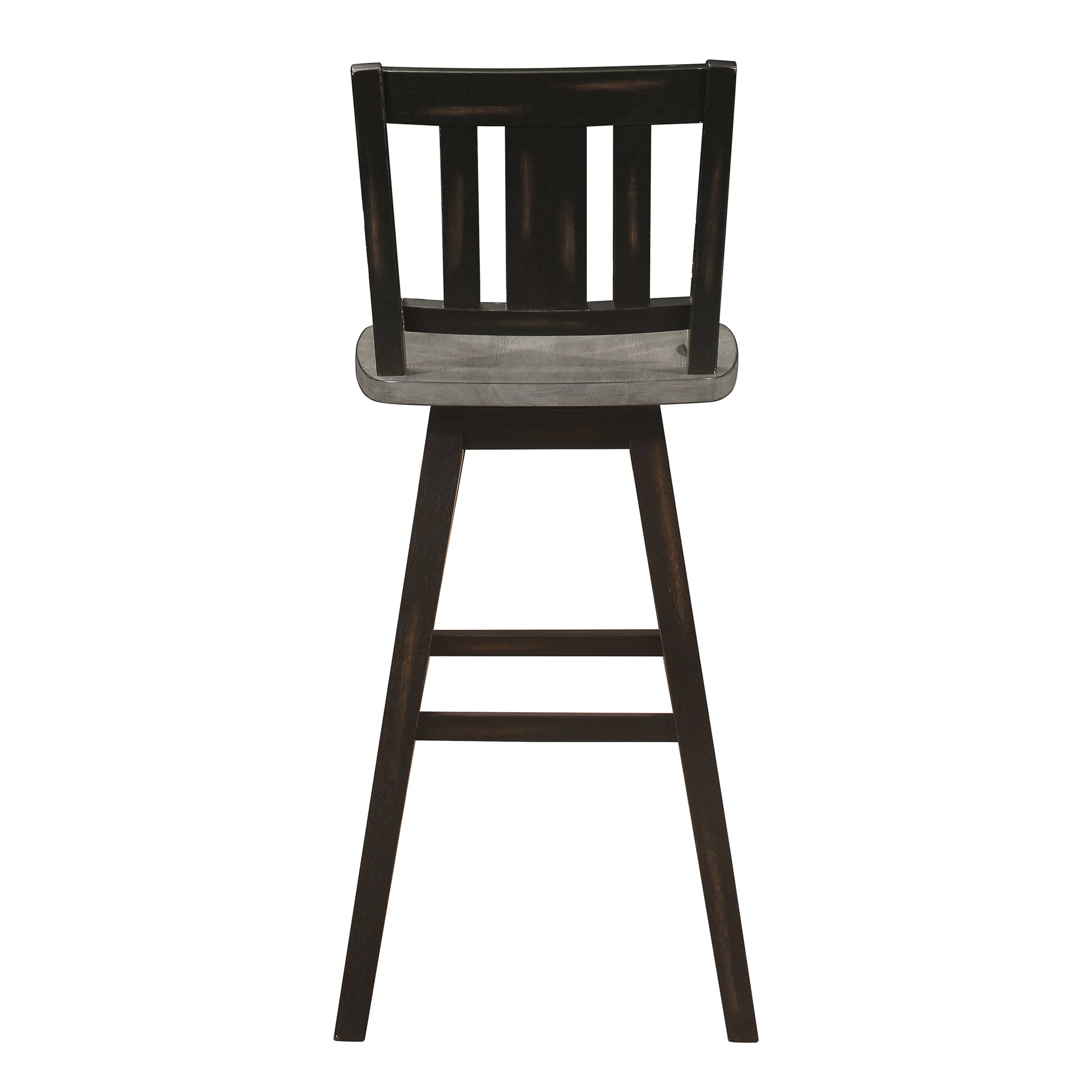 Creating a subtle rustic look for your dining space is the Amsonia Collection. A black sand-through finish graces the solid rubberwood 29-inch swivel vertical slat-back counter height chair, highlighting the veneer.