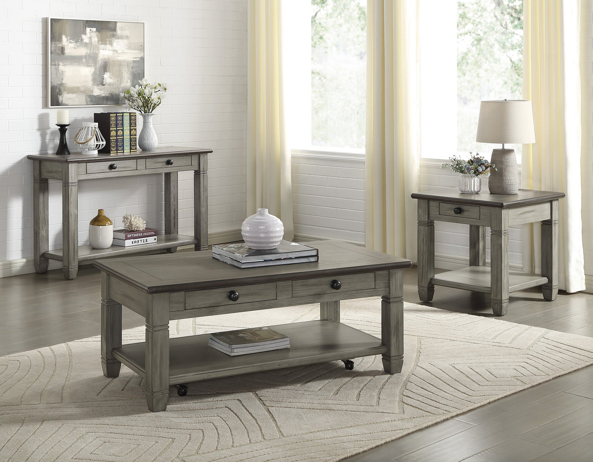 Inspired by the aesthetic of a casual country home and providing functional decorative accent for your living room is the occasional table set of the Granby Collection. The two-tone look of the acacia and pine solids base, finished in antique gray, and the oak veneer of the end table’s coffee-finished tops, present as a harmonious combination of color, perfect for your home. Dark finished metal knob hardware fronts the functional drawer while providing subtle contrast to the finish of the collection. An open display shelf creates a perfect spot for display of your decorative accessories.