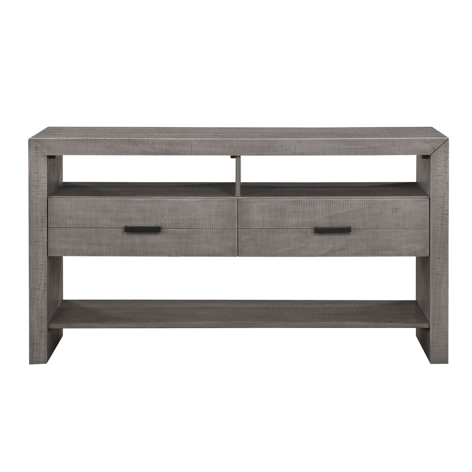 At the intersection of modern and rustic design, the Gresham Collection brings you to a full stop. Clean lines are paired with the natural beauty of acacia veneer, while a gray finish lends neutral versatility to the décor of your casual dining room. The rustic look of the server’s plank styling is interrupted by the modern lines of the piece’s angled edge. The open display shelving of the server further lends to the modern look of the collection while providing drawer storage for your tabletop décor.