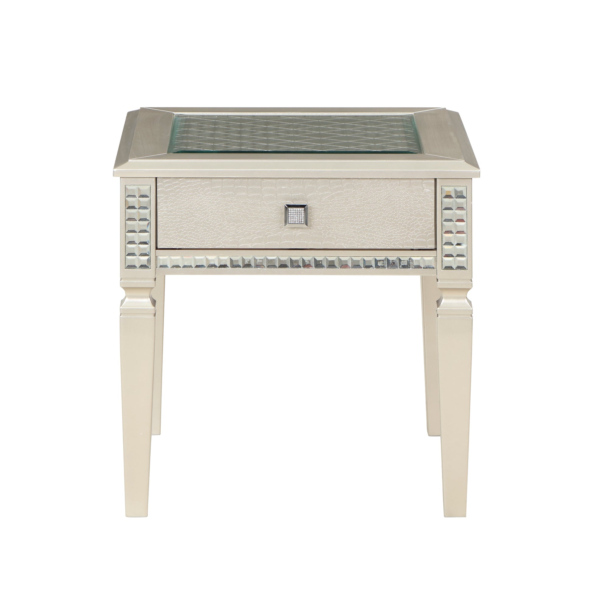 Radiating the iconic beauty of glamorous styling, the Juliette Collection is an elegant addition to your living room. The silver finish of the collection is reflected in the mirror trim that defines the profile of the end table. The stylized legs that support the table lend subtle traditional accent while the decorative elements create a glamorous aesthetic. A storage drawer is conveniently located on the table’s apron with its embossed front featuring crystal-enhanced drawer knobs. An inset glass panel tops the end table, its presence serving to display the embossed and diamond patterned surface.