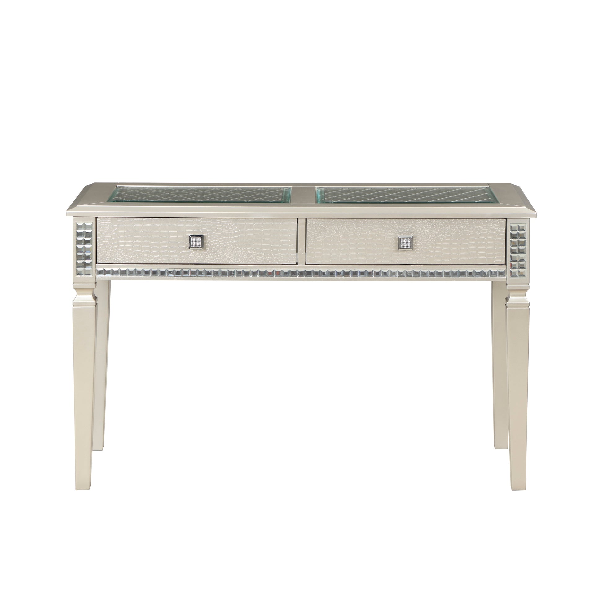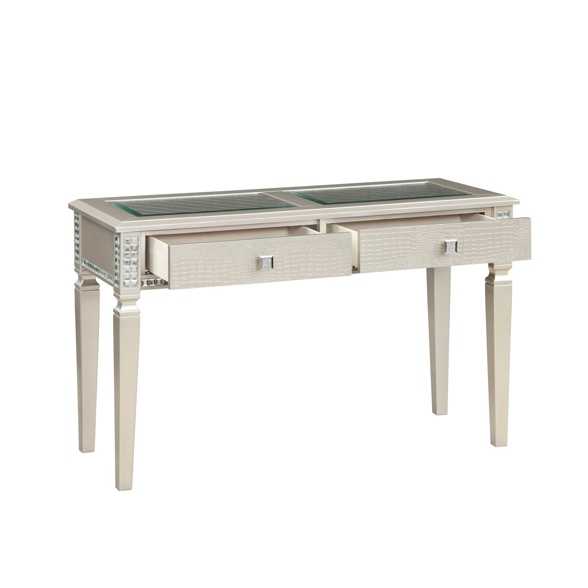 Radiating the iconic beauty of glamorous styling, the Juliette Collection is an elegant addition to your living room. The silver finish of the collection is reflected in the mirror trim that defines the profile of the sofa table. The stylized legs that support the table lend subtle traditional accent while the decorative elements create a glamorous aesthetic. Storage drawers are conveniently located on the table’s apron with their embossed fronts featuring crystal-enhanced drawer knobs. Inset glass panels top the sofa table, their presence serving to display the embossed and diamond patterned surface.