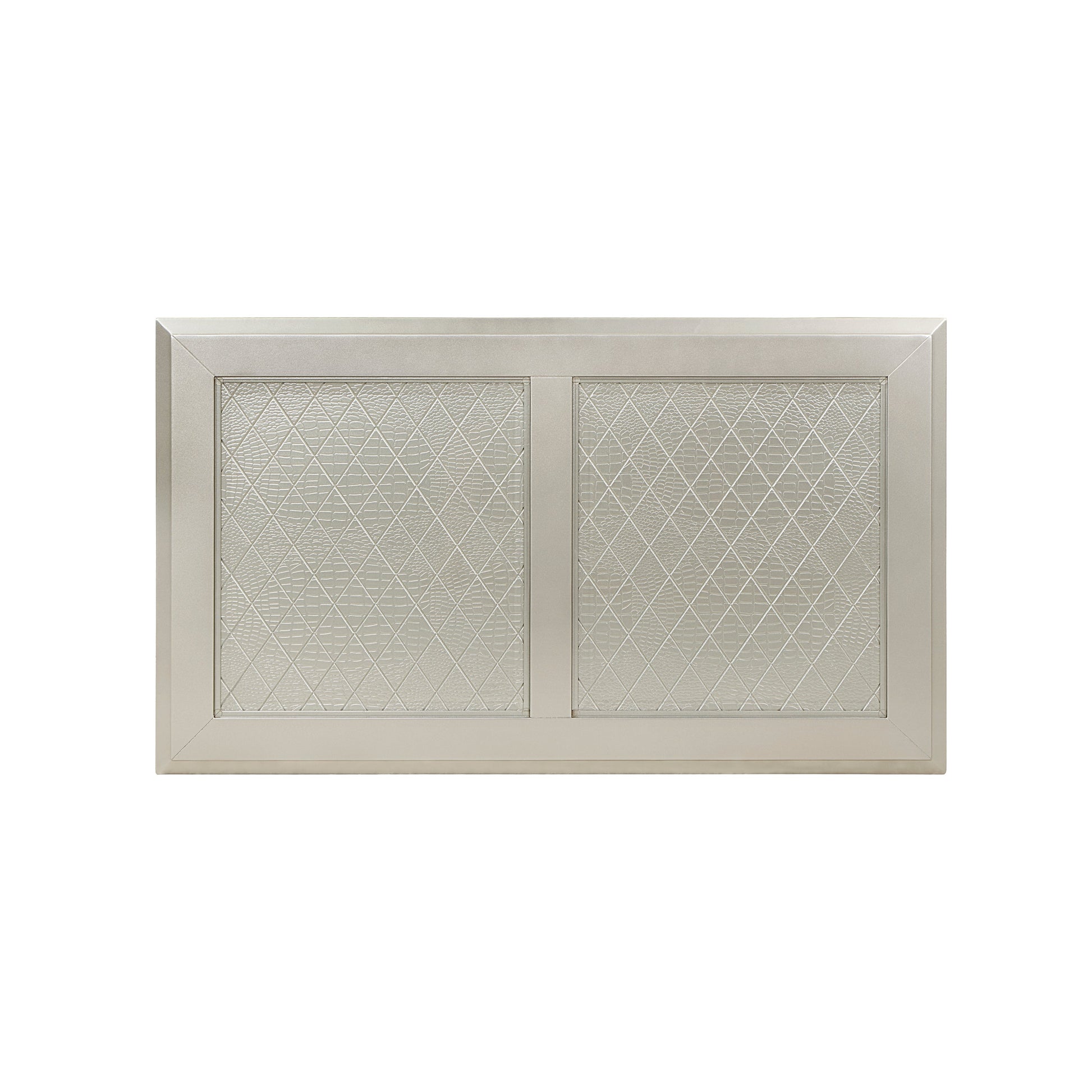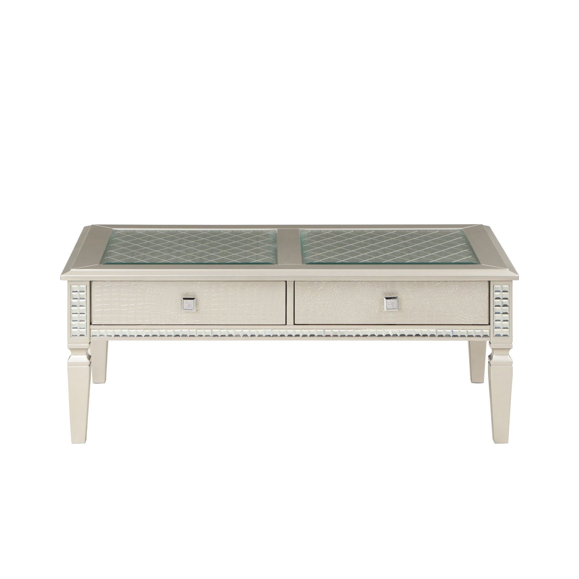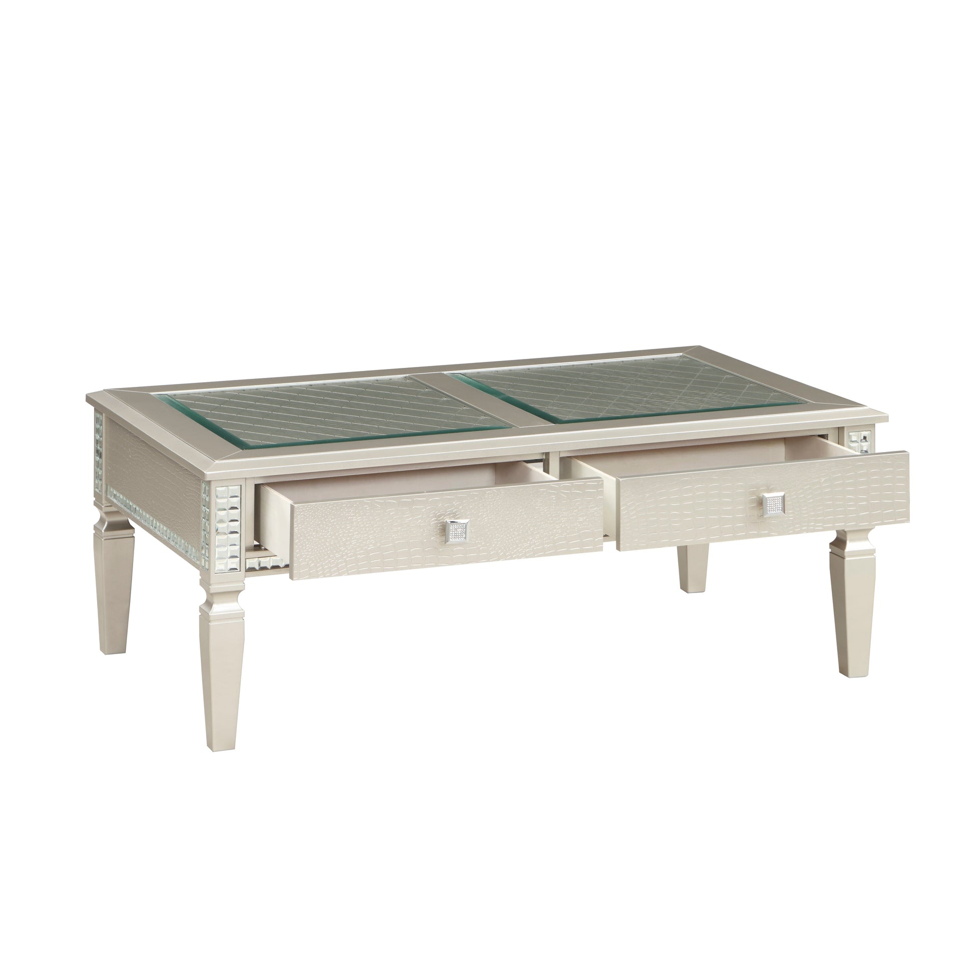 Radiating the iconic beauty of glamorous styling, the Juliette Collection is an elegant addition to your living room. The silver finish of the collection is reflected in the mirror trim that defines the profile of the cocktail table. The stylized legs that support the table lend subtle traditional accent while the decorative elements create a glamorous aesthetic. Storage drawers are conveniently located on the table’s apron with their embossed fronts featuring crystal-enhanced drawer knobs. Inset glass panels top the cocktail table, their presence serving to display the embossed and diamond patterned surface.