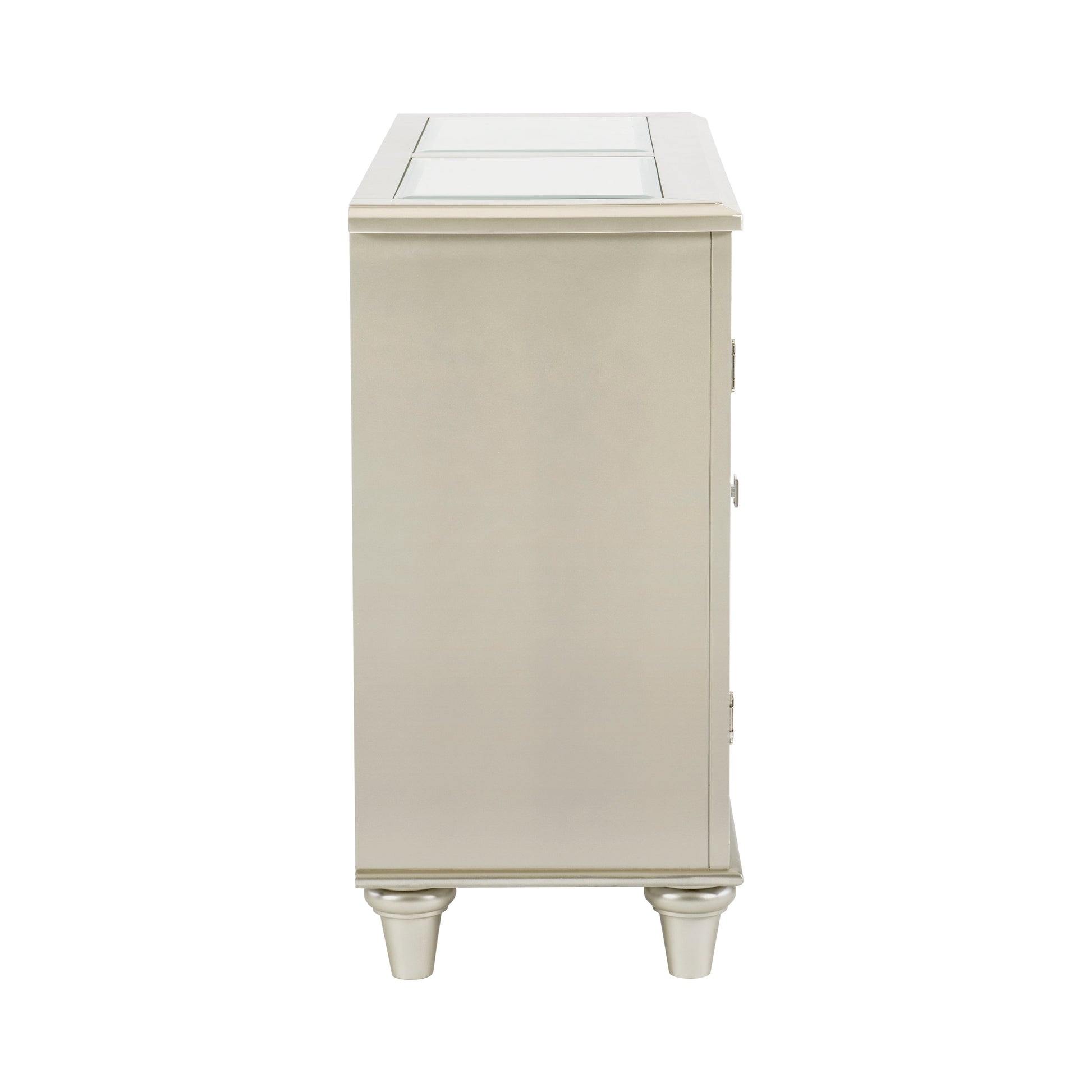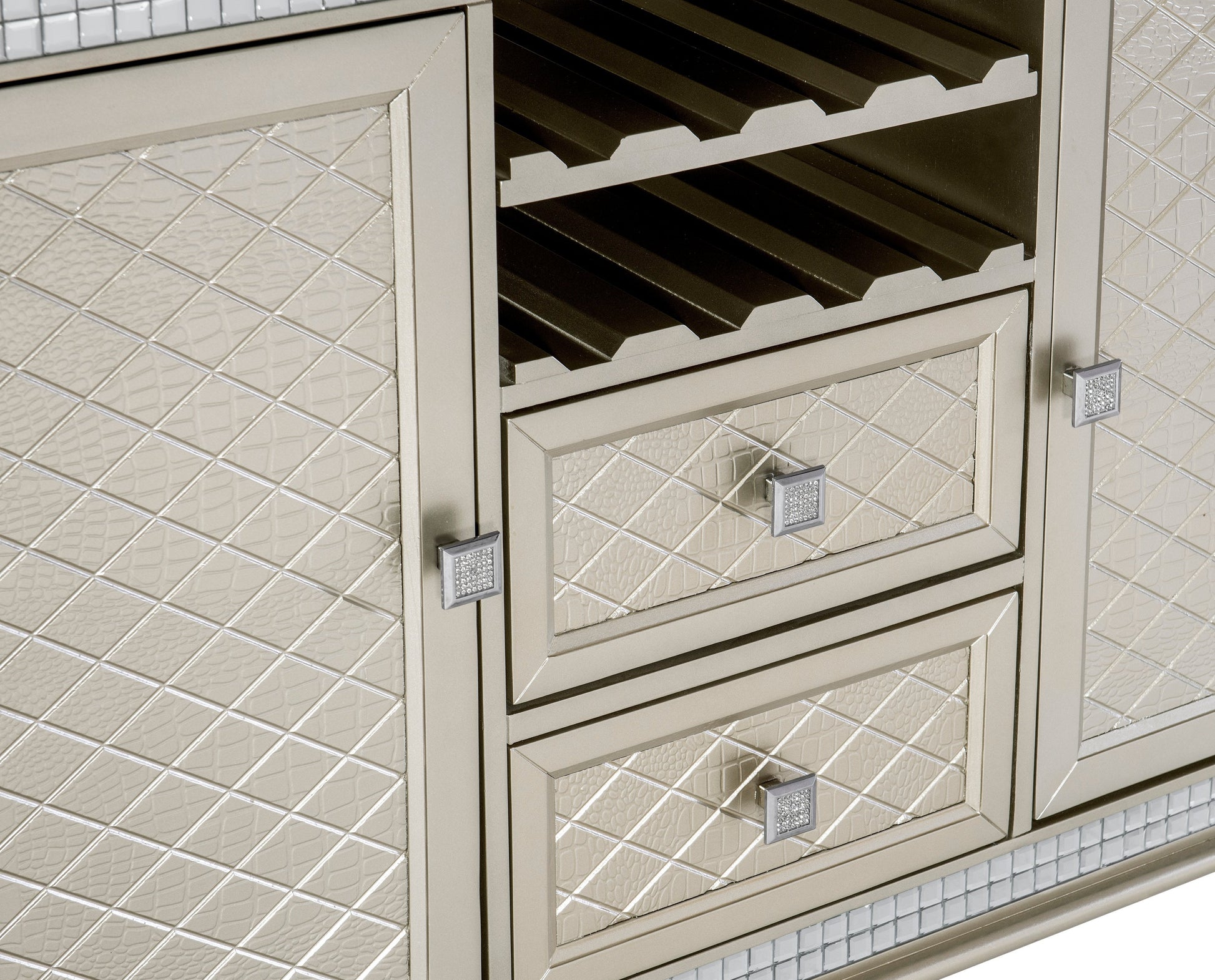Radiating the iconic beauty of glamorous styling, the Juliette Collection is an elegant addition to your dining room. The silver finish of the collection is reflected in the mirror trim that defines the profile of the server. Inset glass panels top the server, their presence serving to display the embossed and diamond patterned surface. Turned feet lend subtle traditional accent while the decorative elements create the glamorous aesthetic. The server features embossed drawer and door fronts, each accentuated by diamond pattering and crystal-enhanced drawer knobs. A wine bottle rack provides open display of your desired vintage.