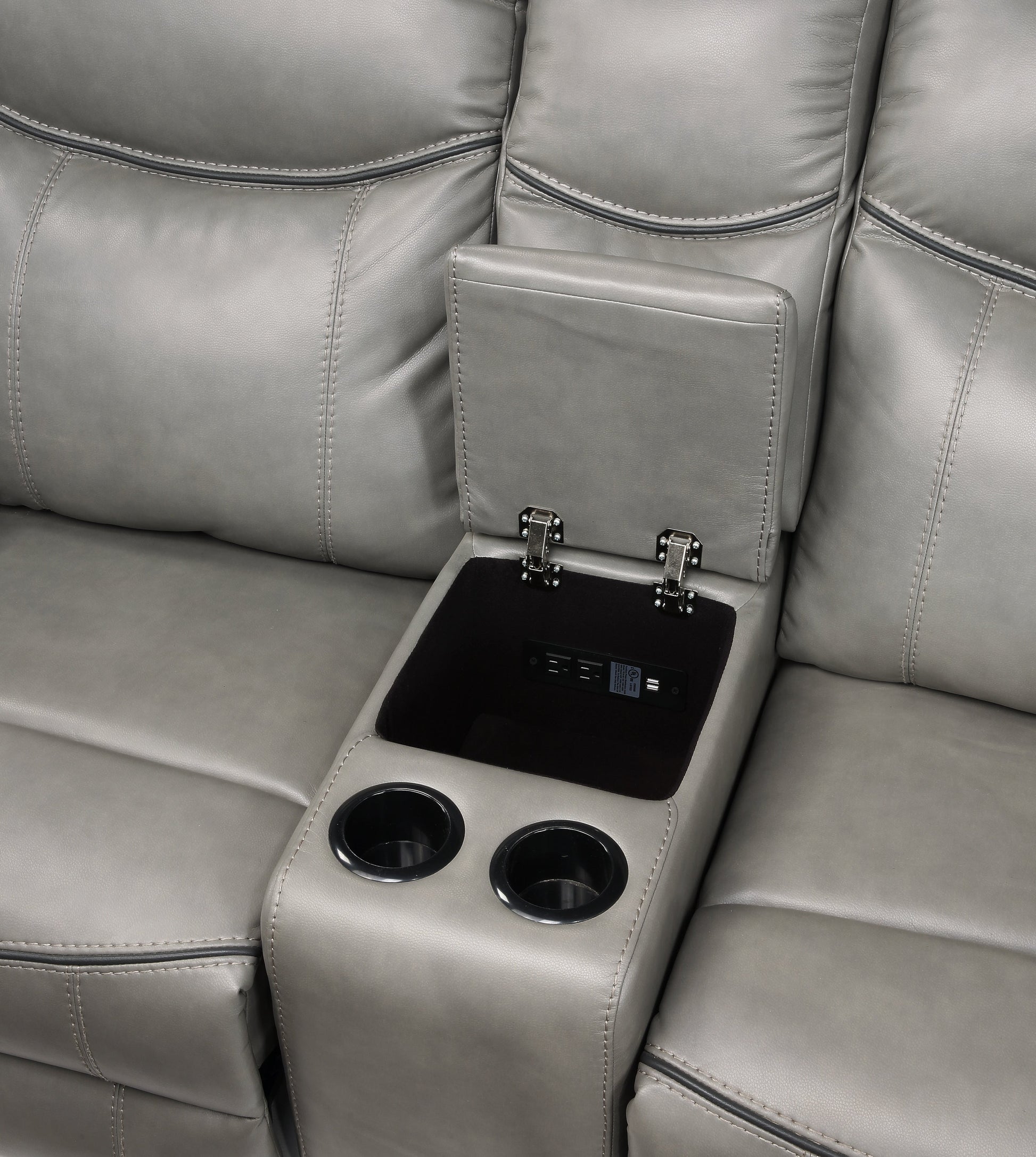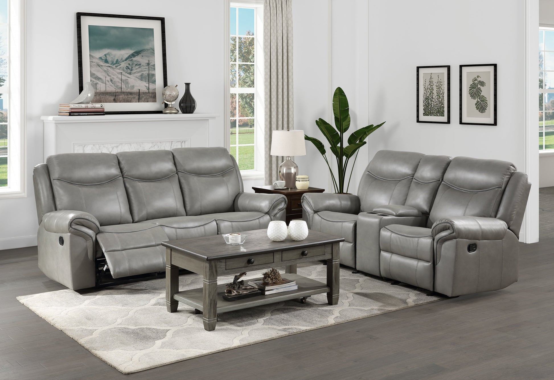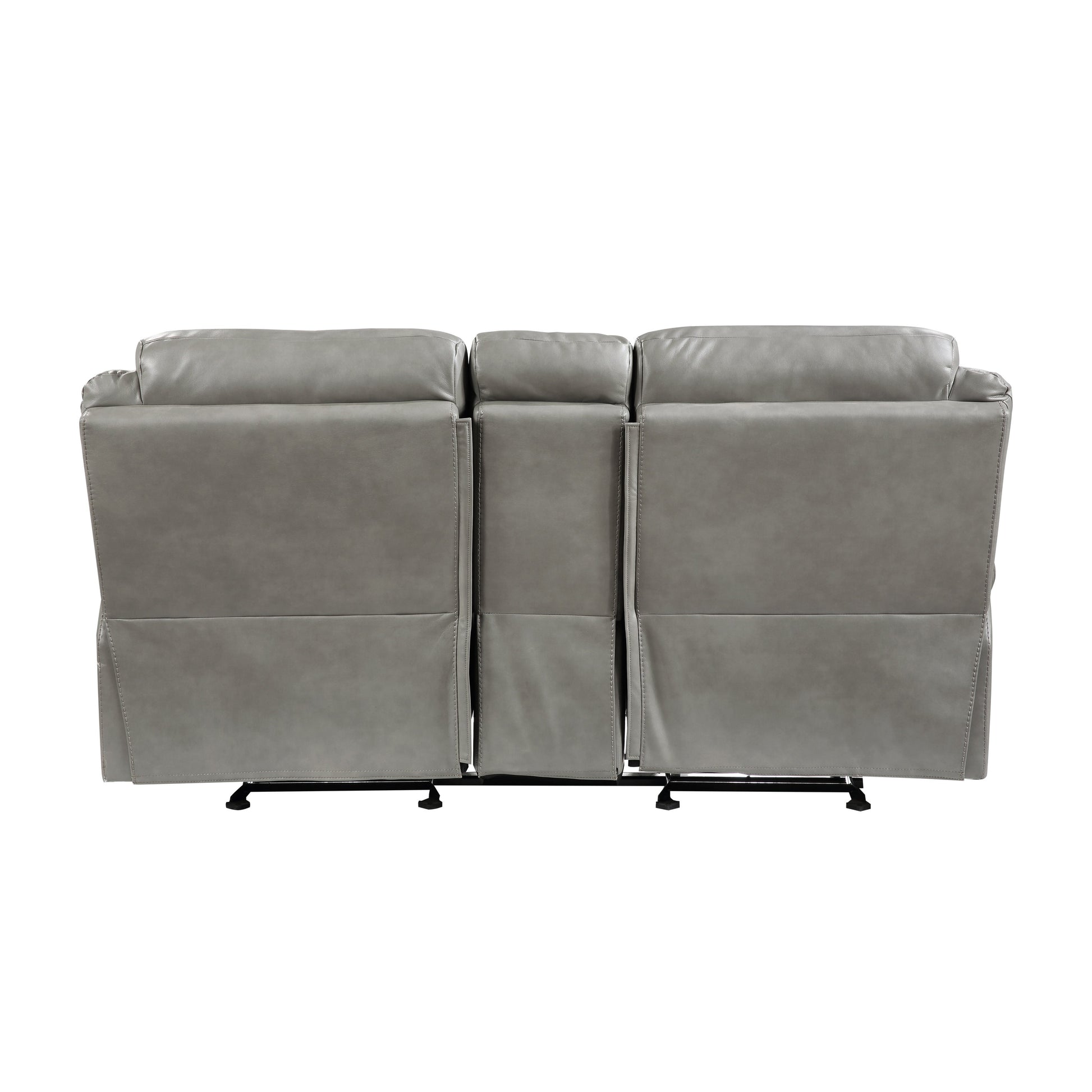 Plush seating, functional accessories and versatile styling blend effortlessly to create the look of the Aram Collection. The gray breathable faux leather upholstery covering will pair perfectly with your transitional decorative preference. The dual glider reclining ends of the love seat flank the center console which features cupholders, as well as electric and USB receptacles that are located within the storage compartment. The manual motion reclining mechanisms of the love seat operate with the pull of a side-mounted tab, that once engaged, take you from seated to reclined in an easy motion.