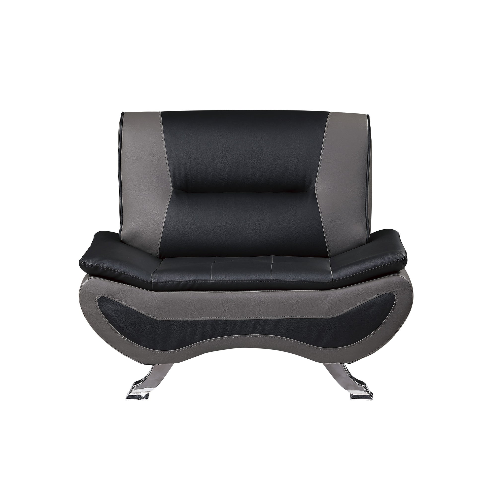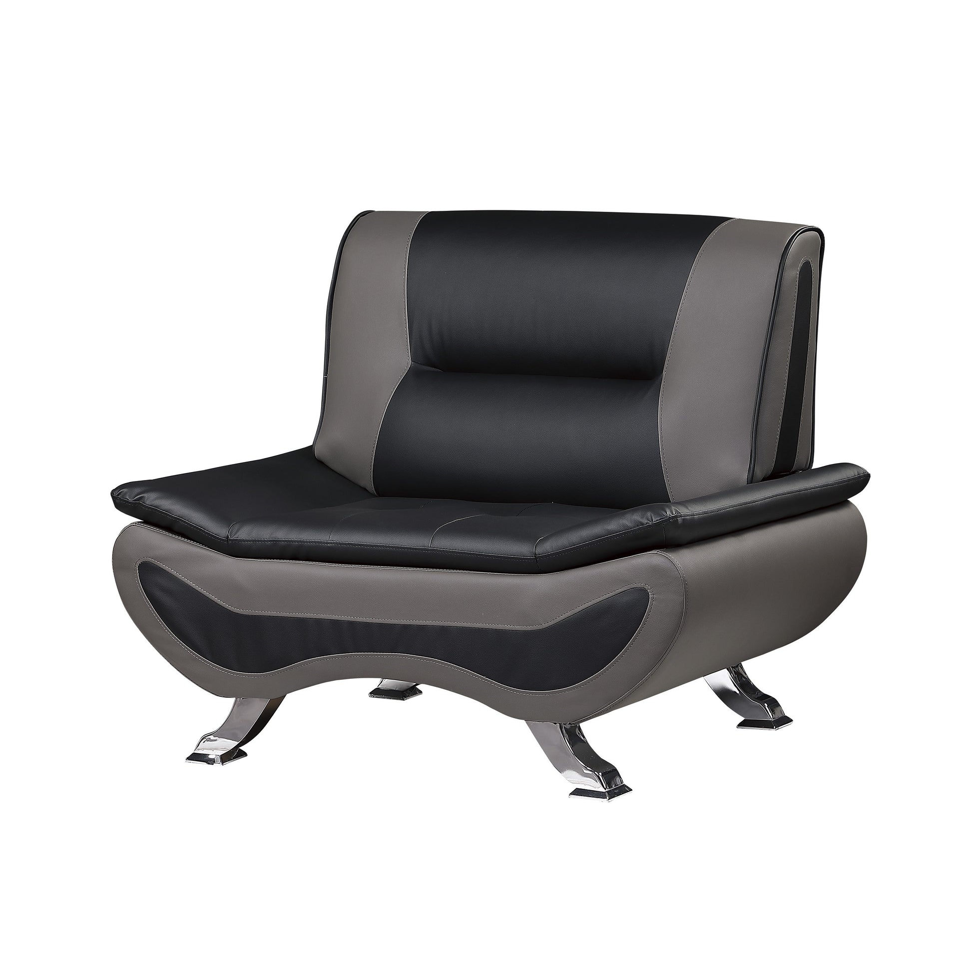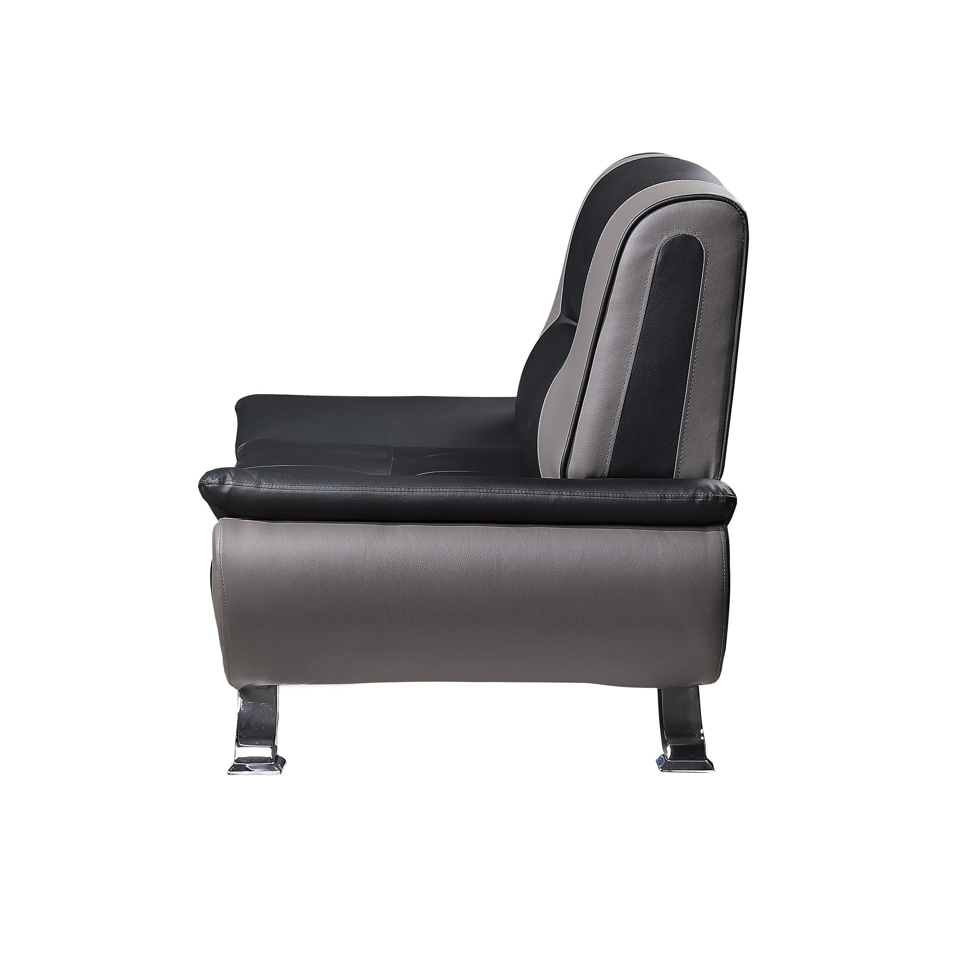 Bringing to mind the sleek styling of an Italian race car, bold contemporary styling creates eye-catching drama for your living room with the Veloce Collection. Color blocked black and gray faux leather covers the ultra-low profile sofa, while chrome legs provide support.