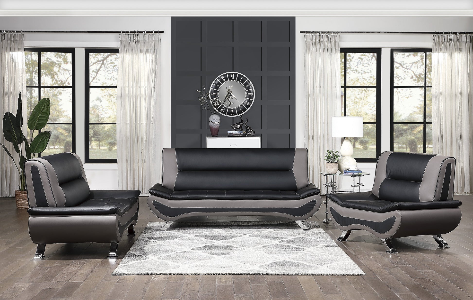Bringing to mind the sleek styling of an Italian race car, bold contemporary styling creates eye-catching drama for your living room with the Veloce Collection. Color blocked black and gray faux leather covers the ultra-low profile chair, while chrome legs provide support.