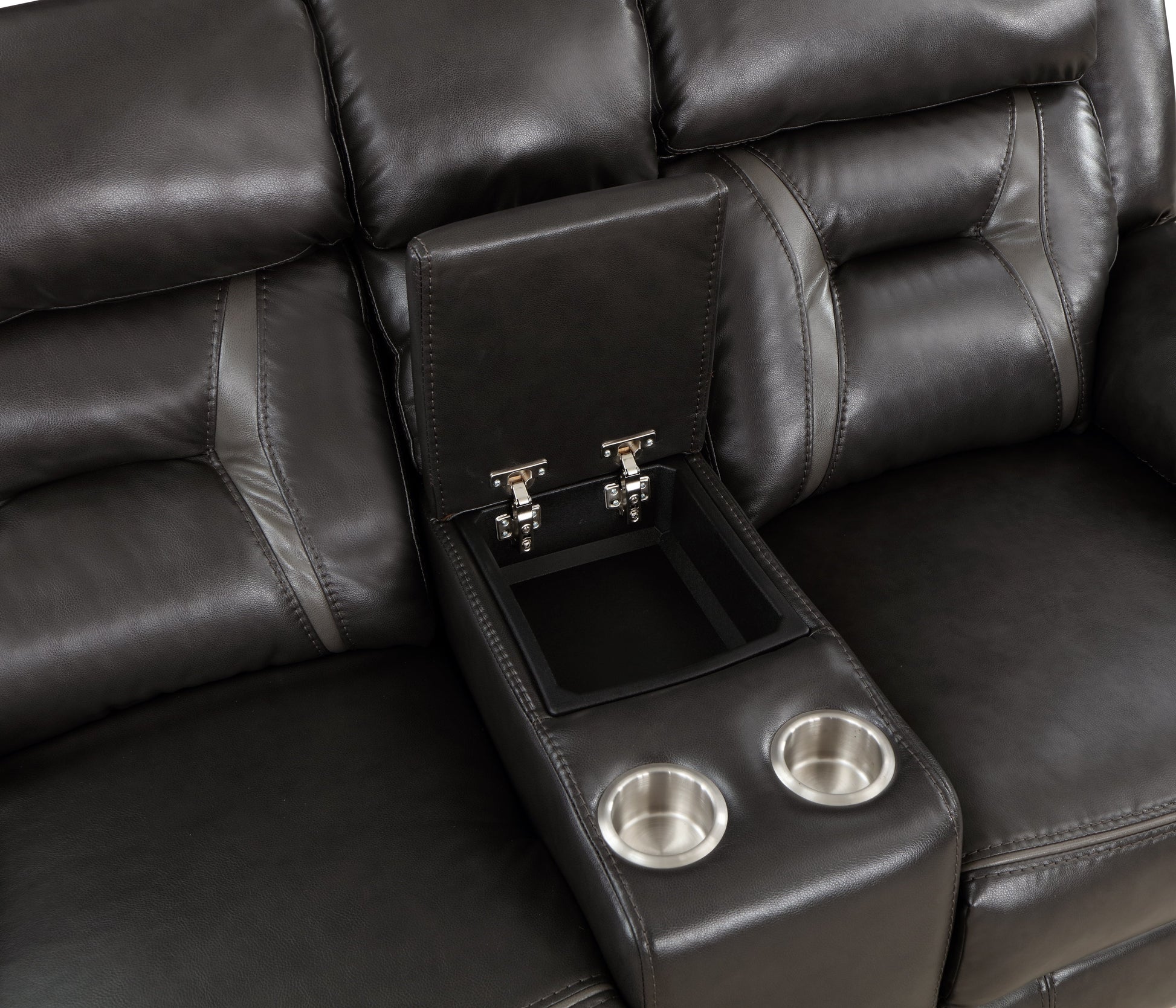Ultra-modern design combined with convenient function makes the Amite Collection a stylish addition to your contemporary home. dark gray premium faux leather upholstery is perfectly complemented by light gray accenting on the seatbacks, seats, and arms of the love seat providing contrast and definition to the profile of the collection. With the push of the power reclining mechanism, the recliners ease to the prone position. The love seat features a console unit with hidden storage as well as cup holders for convenient functional use. Providing additional function is the side-mounted USB port on the recliners, providing quick access to your electronic device as it charges.