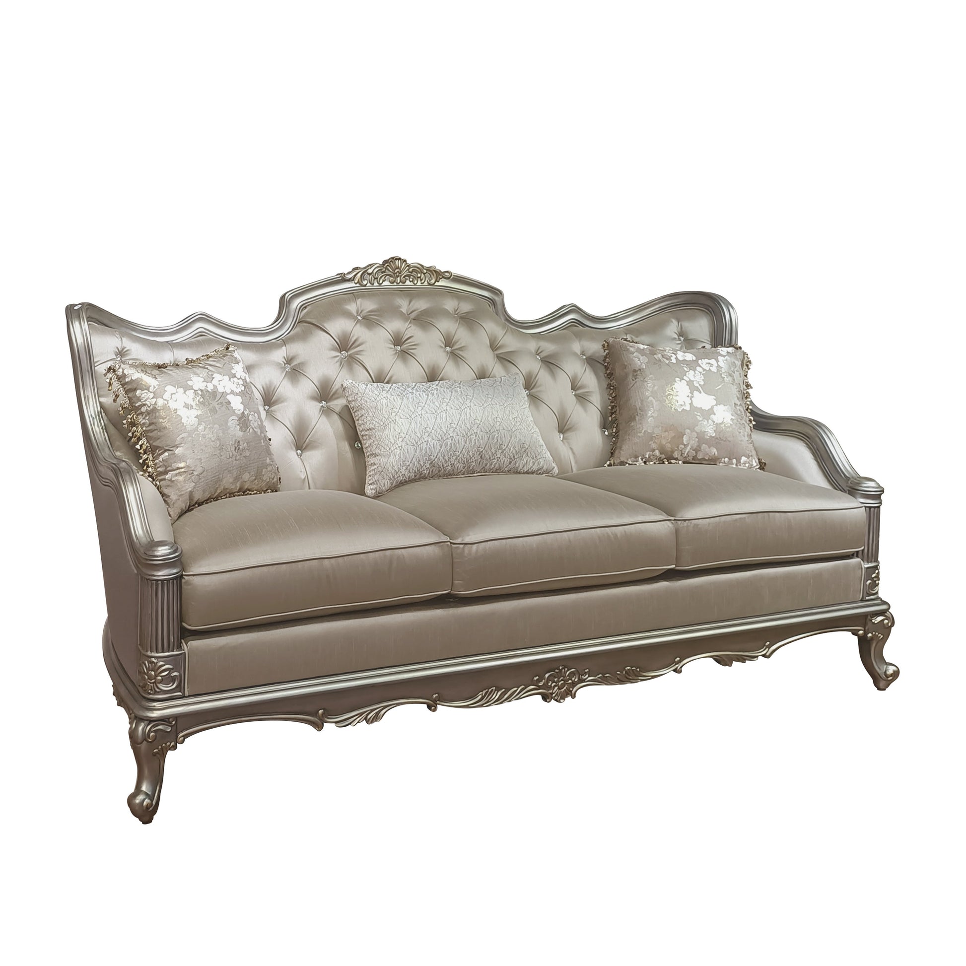 The elaborate designs of Old World Europe are treated with a distinct modern touch in the Florentina Collection. The eye-catching jewel tufting reflects with a brilliance intended to accentuate the dusky taupe coloring of the silk like fabric and the rich silver, with gold undertone finish of the show wood frame. With details such as shell and acanthus leaf scrolling, routed pilaster and cabriole legs, the traditional look of the sofa is solidified. The accenting silk like toss pillows feature traditional fringe detailing and a complementing detail pattern. The series 8412 Florentina Seating and Occasional Collections complement the Homelegance series 1867 Florentina Bedroom and Dining Collections.