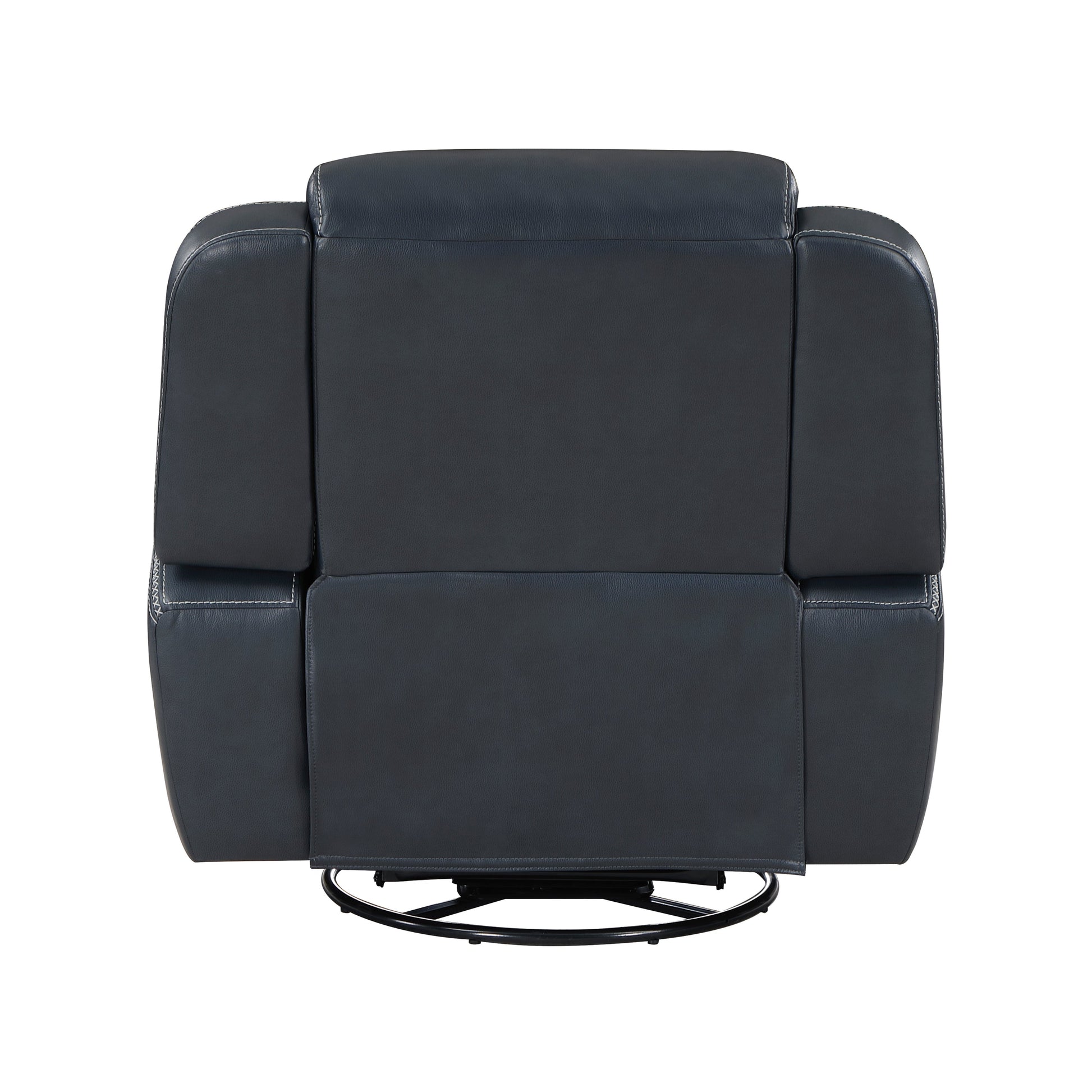 Settle in and get comfortable, the Littleton Collection is ripe with functional accents to elevate your seated experience. Blue breathable faux leather covers the collection with white contrast stitching defining the modern contoured profile and seats of the collection. The 360-degree swivel base of the manually engaged recliner chair has a gentle gliding motion for your maximized comfort.