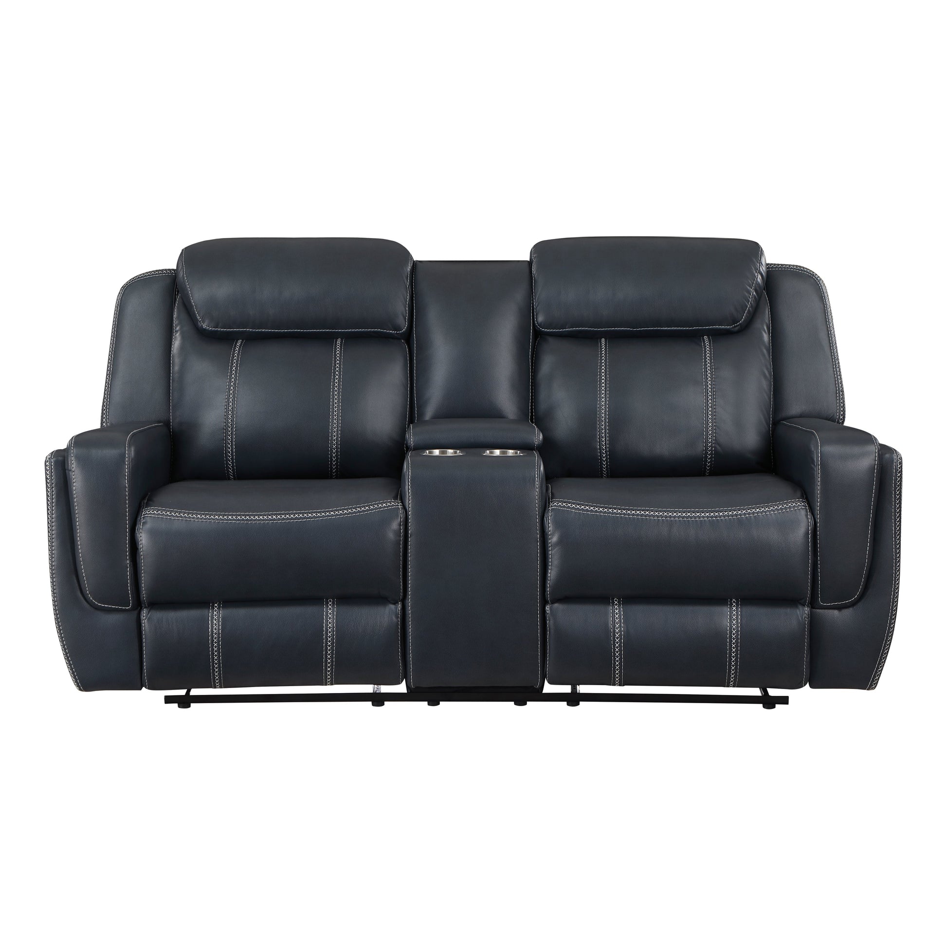 Settle in and get comfortable, the Littleton Collection is ripe with functional accents to elevate your seated experience. Blue breathable faux leather covers the collection with white contrast stitching defining the modern contoured profile and seats of the collection. The love seat features dual end manual motion reclining mechanisms, their function taking you from seated to prone with the pull of the side-mounted motion tabs. The love seat’s center console features hidden storage, two cupholders, receptacles, and USB ports.