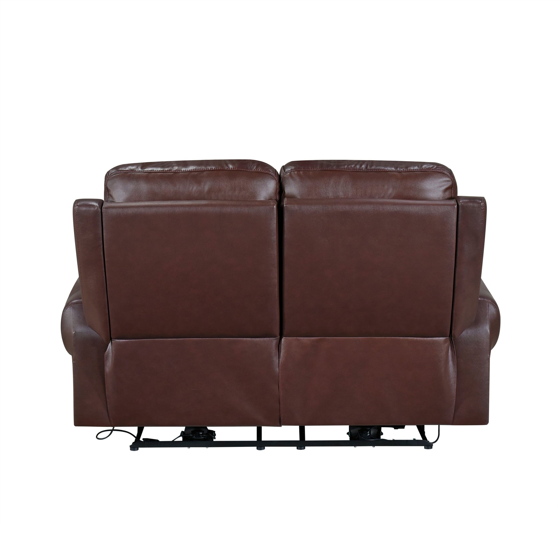 With a style versatility that lends to transitional and traditional environments, the McCall Collection creates a welcoming addition to your home’s living room. The dual reclining ends of the love seat, feature power-adjusted head rests and USB ports, each unit engaged with the side mounted power controls. The transitional frame of the love seat is 100 percent top grain leather where the body touches, with faux leather covering the remaining areas, its brown hue complementing your home’s décor.