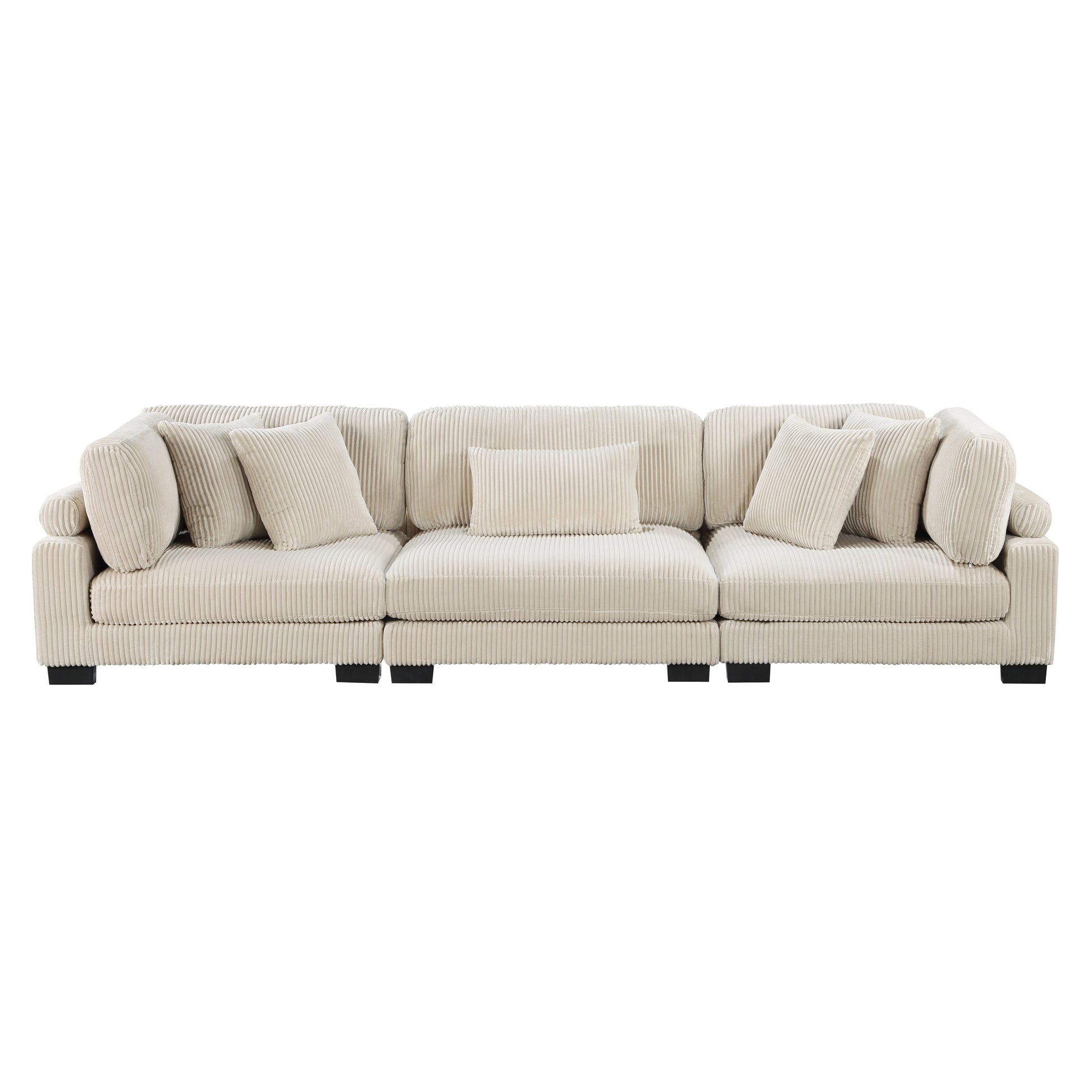 Configurable to your available space, the Traverse Collection allows for the addition and detachment of pieces for a customized seating experience. The sofa configuration consists of two corner units paired with a centrally placed armless chair. The plush beige corduroy fabric upholstery creates a plush expanse for a soft touch experience. The corner seat features two toss pillows, adjustable back and arm rest, and reversible cushions. The armless chair features a lumbar pillow, and reversible cushions.