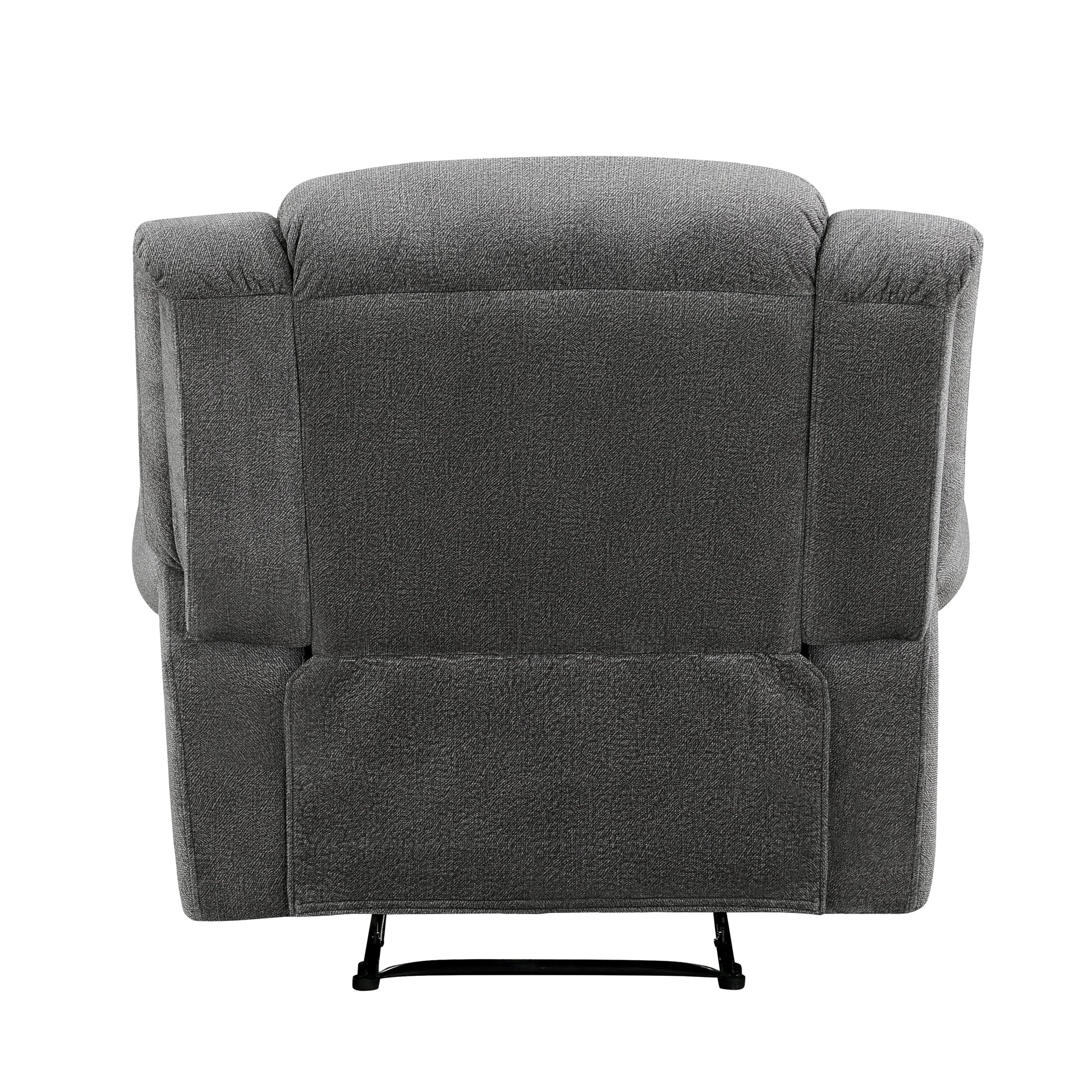 Styled for the transitional home, the Brennen Collection’s comfortable presence will be a perfect match for your casual living room. The chair features a manual reclining mechanism allowing for ease of motion when going from seated to reclined. Plush seating is defined by the contoured stitching, while the arms of the chair are accented with nail head trim. Charcoal-hued textured microfiber covers the seating group, providing soft touch and decorative versatility.