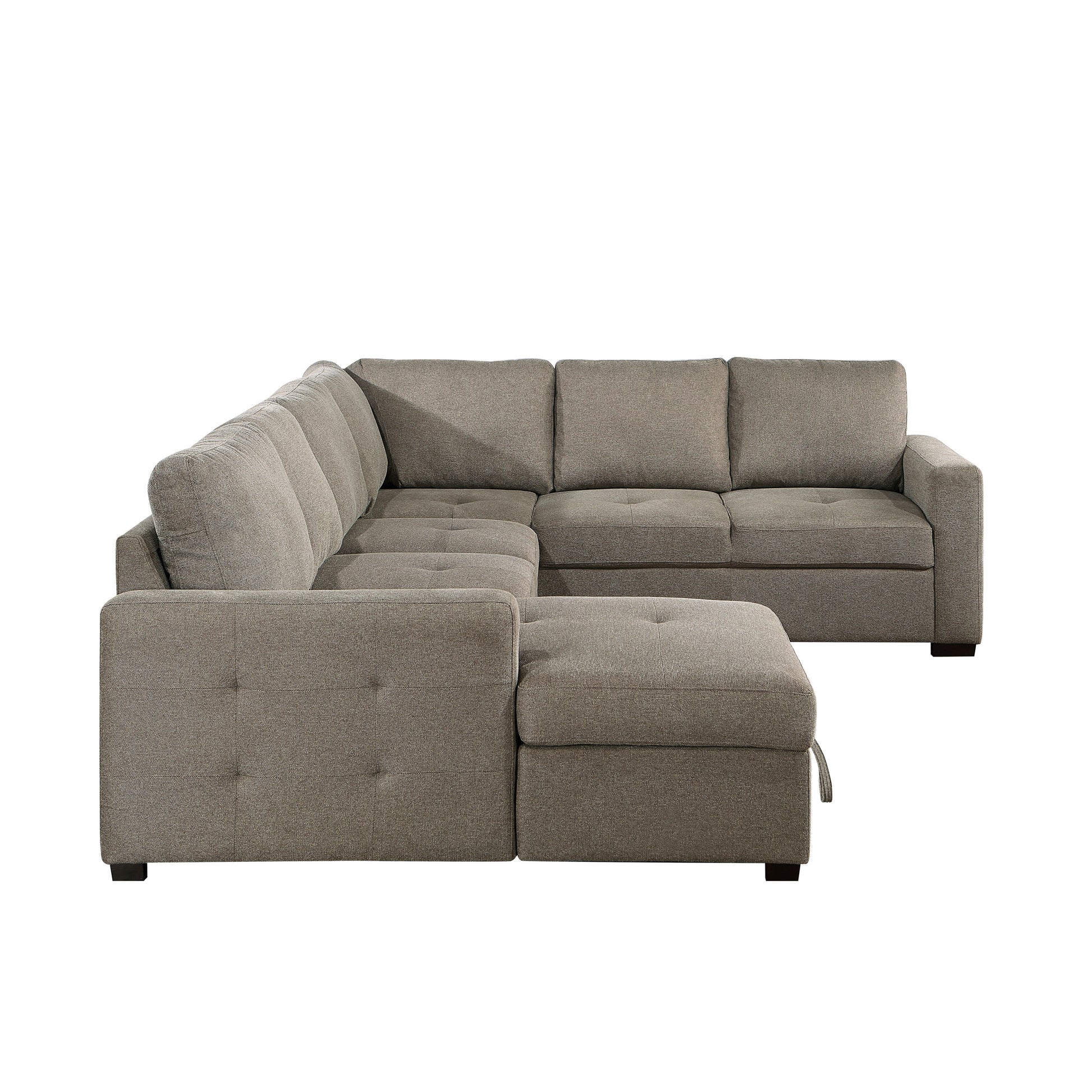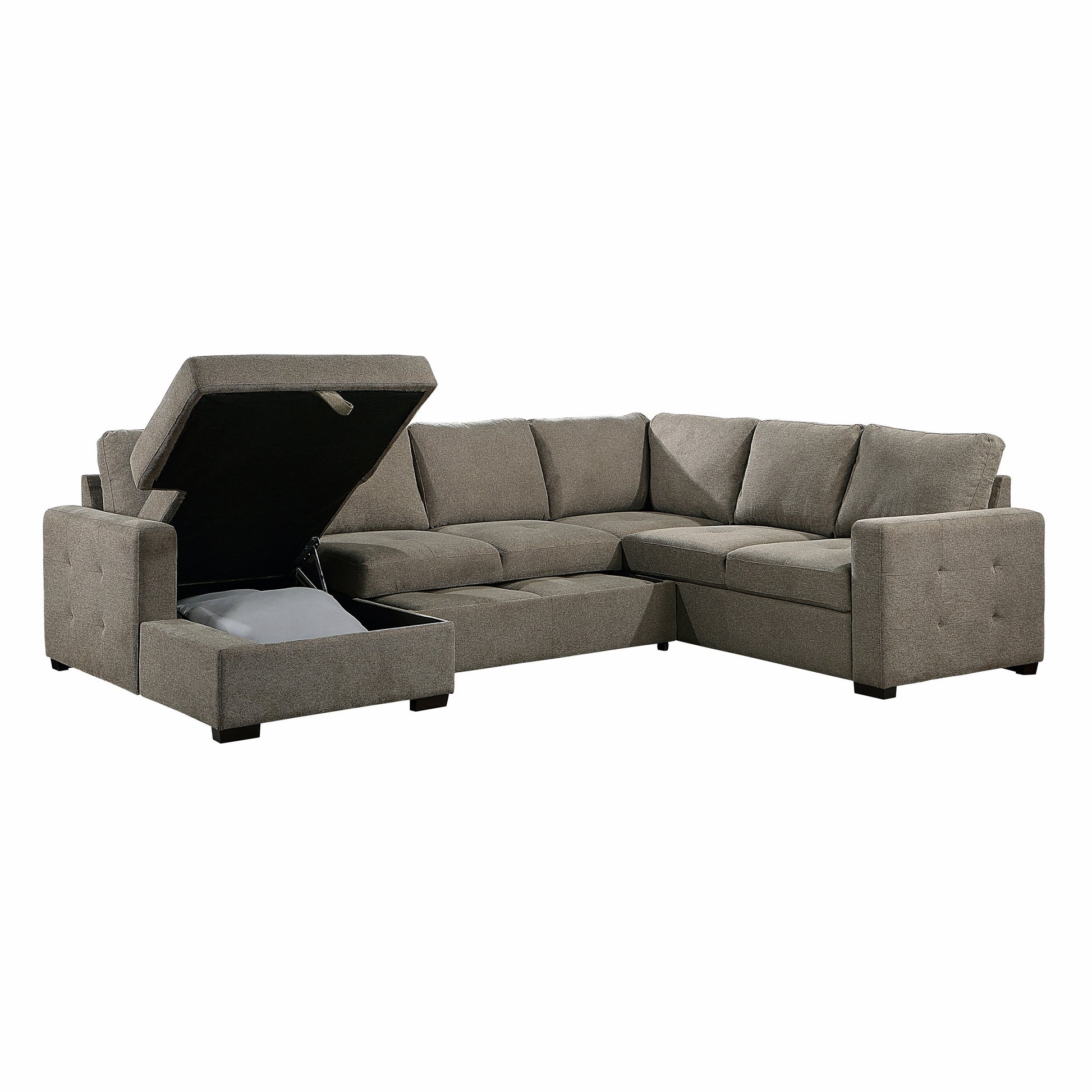 The transitional styling of the Elton Collection is paired with versatility of use to create a multifunctional seating arrangement for your home. A pull-out bed rises from the right-side two-seat armless unit to transform your sectional into a bed while hidden storage within the left-side chaise provides convenient placement of soft goods or accessories. The Elton Collection is offered in a brown textured upholstery, solidifying its versatile design.