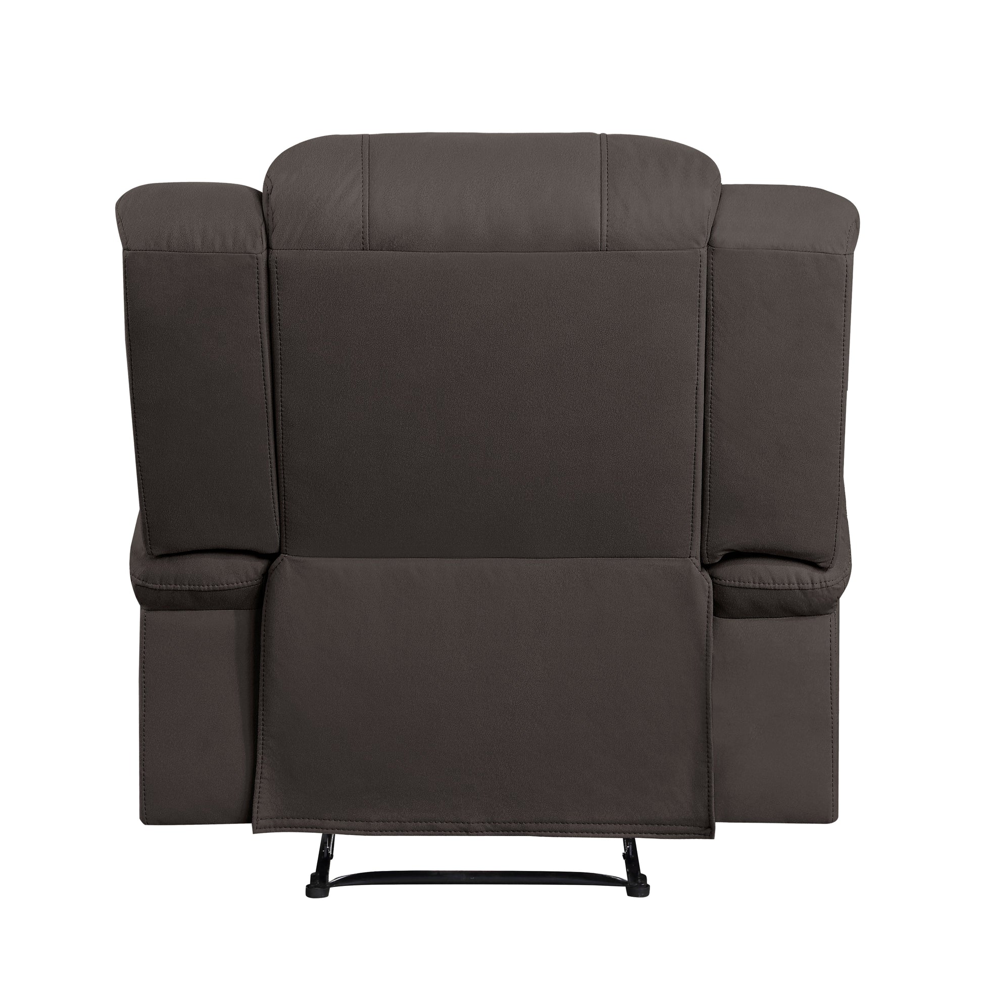 Complementing your living room’s transitional style is the Camryn Collection. The manual motion mechanism of the chair allows for ease of motion when going from seated to reclined. Contoured stitching defines the seating of the group while the chocolate-hued polished microfiber upholstery that covers the collection is a subtle pop of color for your living room’s décor.