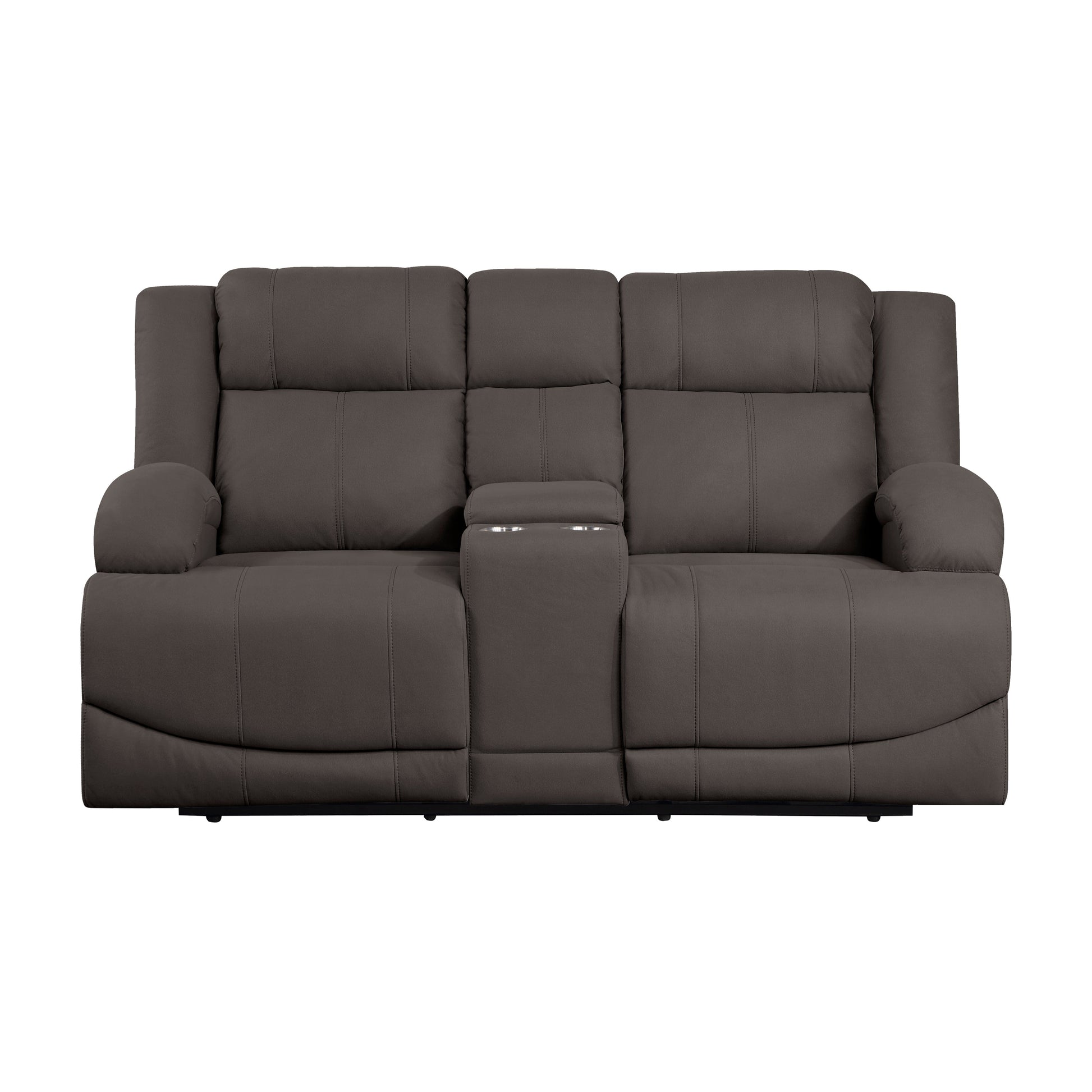Complementing your living room’s transitional style is the Camryn Collection. The power motion mechanisms of the love seat allows for ease of motion when going from seated to reclined. The love seat’s console with its lift-top hidden compartment and cupholders, provides a convenient spot for beverage and accessory storage. Contoured stitching defines the seating of the group while the chocolate-hued polished microfiber upholstery that covers the collection is a subtle pop of color for your living room’s décor.
