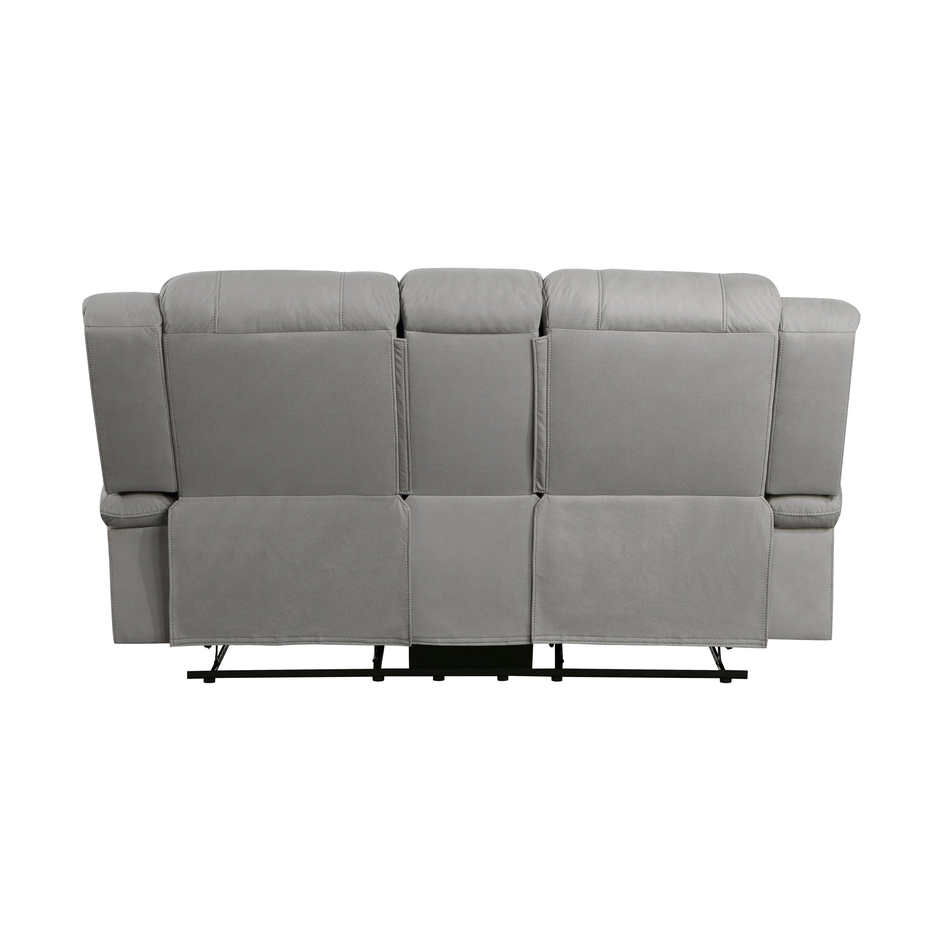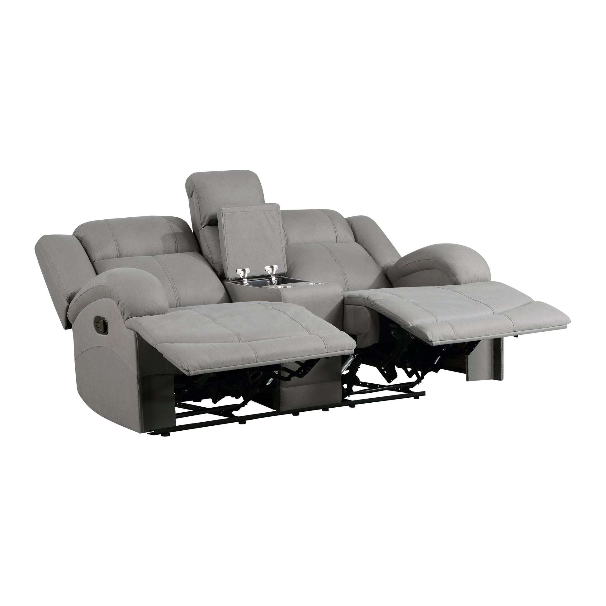 Complementing your living room’s transitional style is the Camryn Collection. The manual motion mechanisms of the love seat allows for ease of motion when going from seated to reclined. The love seat’s console with its lift-top hidden compartment and cupholders, provides a convenient spot for beverage and accessory storage. Contoured stitching defines the seating of the group while the gray-hued polished microfiber upholstery that covers the collection is a subtle pop of color for your living room’s décor.
