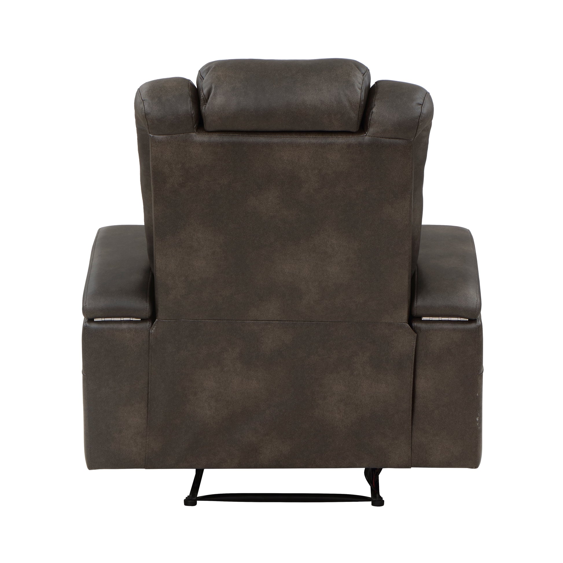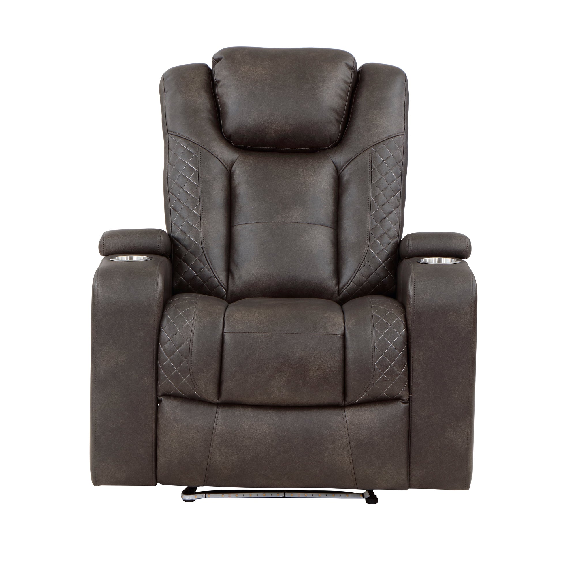 With a combination of stylistic and functional versatility that pairs comfort and modern convenience, the Tabor Collection is outfitted to be a perfect fit in your living room. The reclining chair features a power headrest, storage arms, cupholder and USB port. The chair is covered in brownish gray premium faux leather upholstery where the hand touches – with faux leather everywhere else - and has diamond pattern accent stitching on the seat that provides subtle decorative touch to the group’s versatile look.