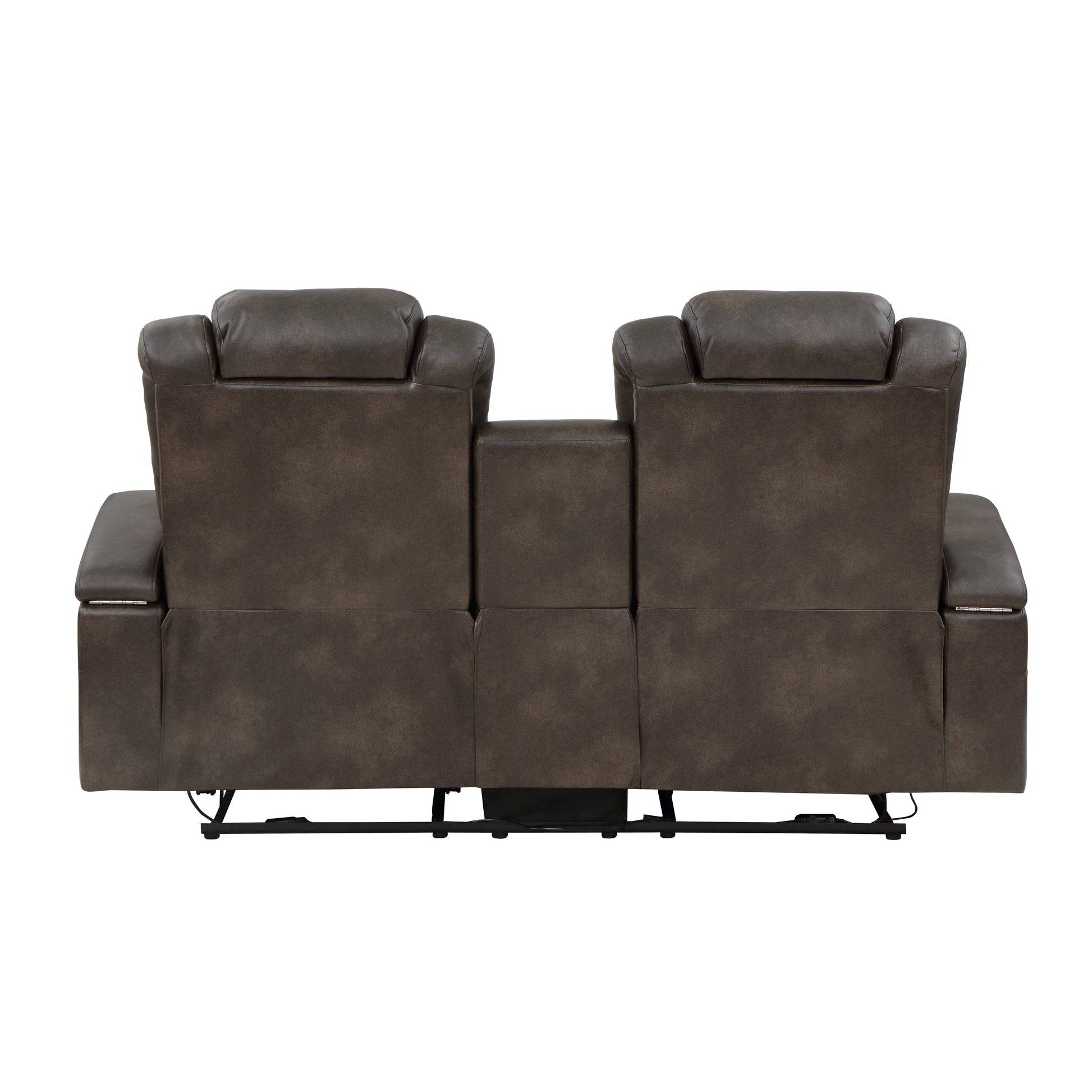 With a combination of stylistic and functional versatility that pairs comfort and modern convenience, the Tabor Collection is outfitted to be a perfect fit in your living room. The love seat features dual reclining ends with power headrests, storage arms, console with cupholders, hidden storage. The love seat is covered in brownish gray premium faux leather upholstery where the hand touches – with faux leather everywhere else - and has diamond pattern accent stitching on the seat that provides subtle decorative touch to the group’s versatile look.