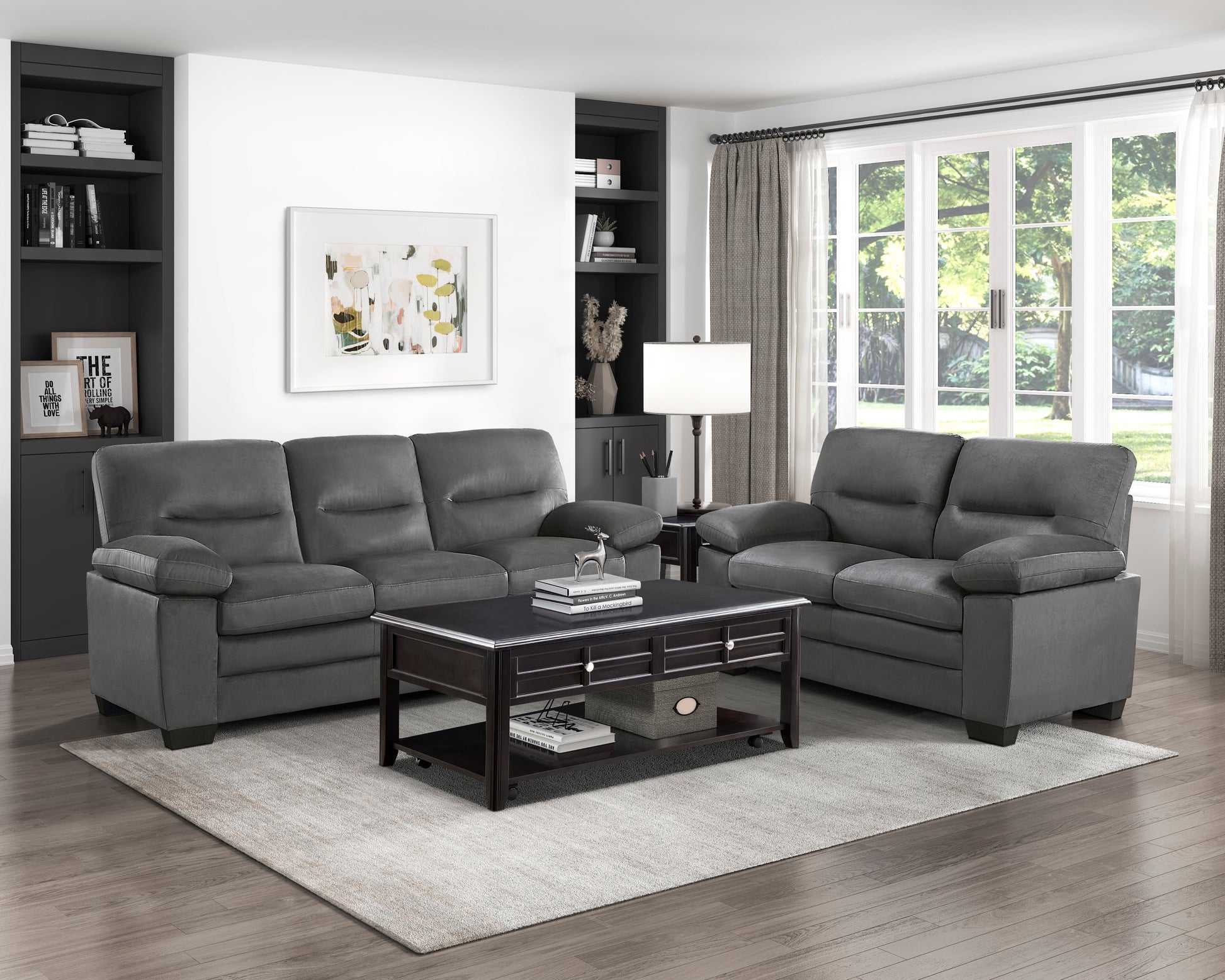 The sleek profile of the Keighly Collection will be the perfect complement to your modern living room. The sofa features a dark gray fabric cover for the ultimate decorative versatility, while pillow-top arms and plush seating create a platform that is perfect for your comfortable seated relaxation.