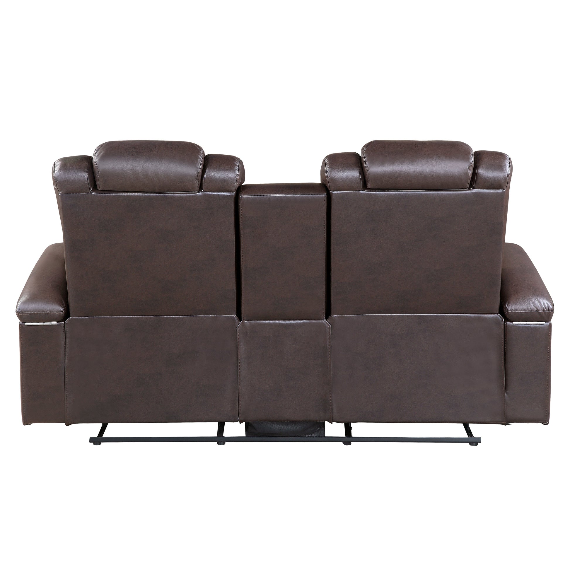 The well-appointed Caelan Collection pairs functional accessories with plush seating, allowing for your maximum efficiency while relaxing. The power motion love seat features dual reclining ends with power headrests, storage arms, console with cupholders, hidden storage, USB ports and receptacles. The collection is covered in dark brown premium faux leather upholstery and has diamond pattern stitching on the seatbacks that provide decorative accent to the group.