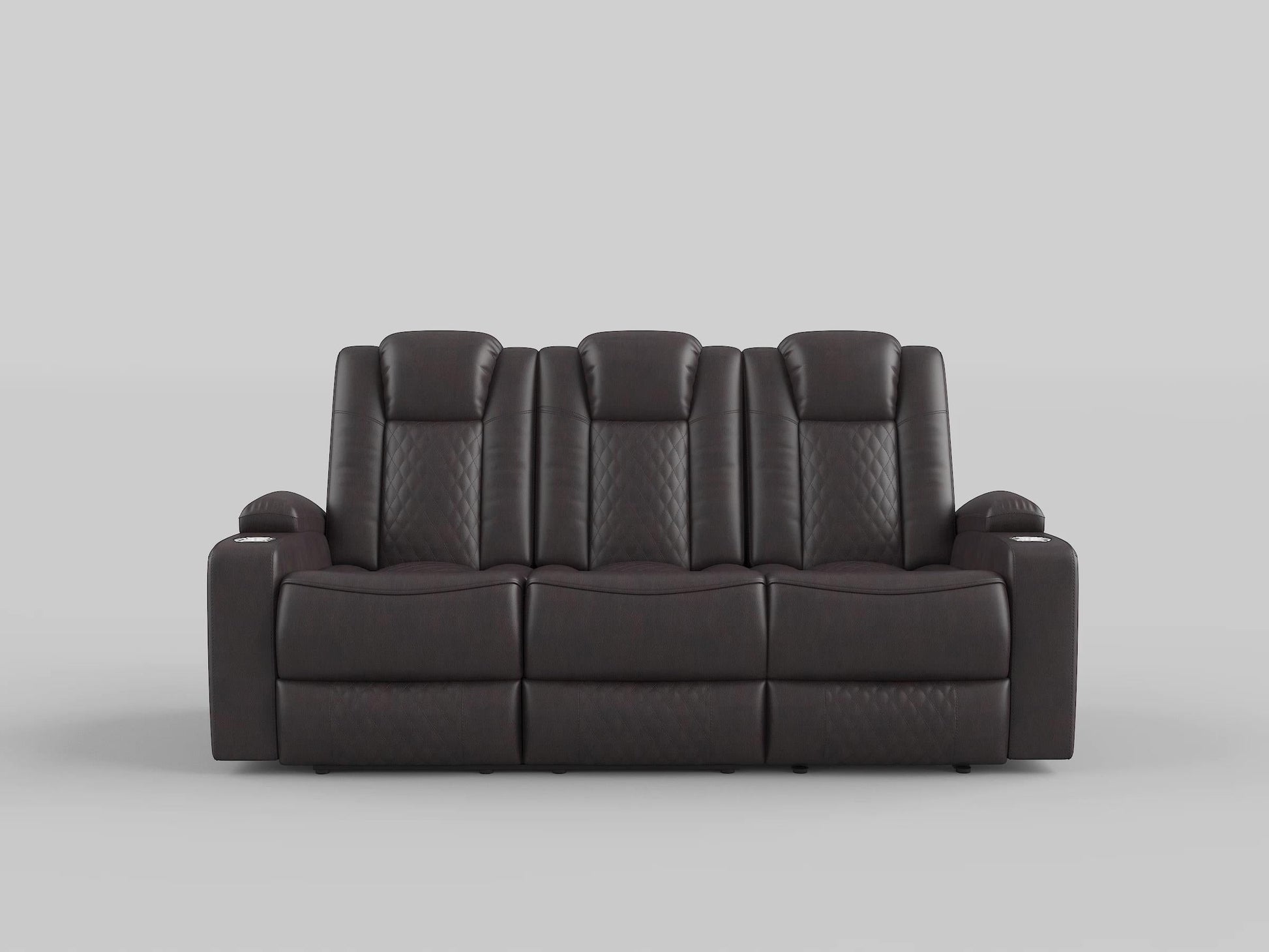 The well-appointed Caelan Collection pairs functional accessories with plush seating, allowing for your maximum efficiency while relaxing. The power motion sofa features dual reclining ends with power headrests, storage arm, drop down seatback that has cupholders, tabletop, receptacles, and USB ports. The collection is covered in dark brown premium faux leather upholstery and has diamond pattern stitching on the seatbacks that provide decorative accent to the group.