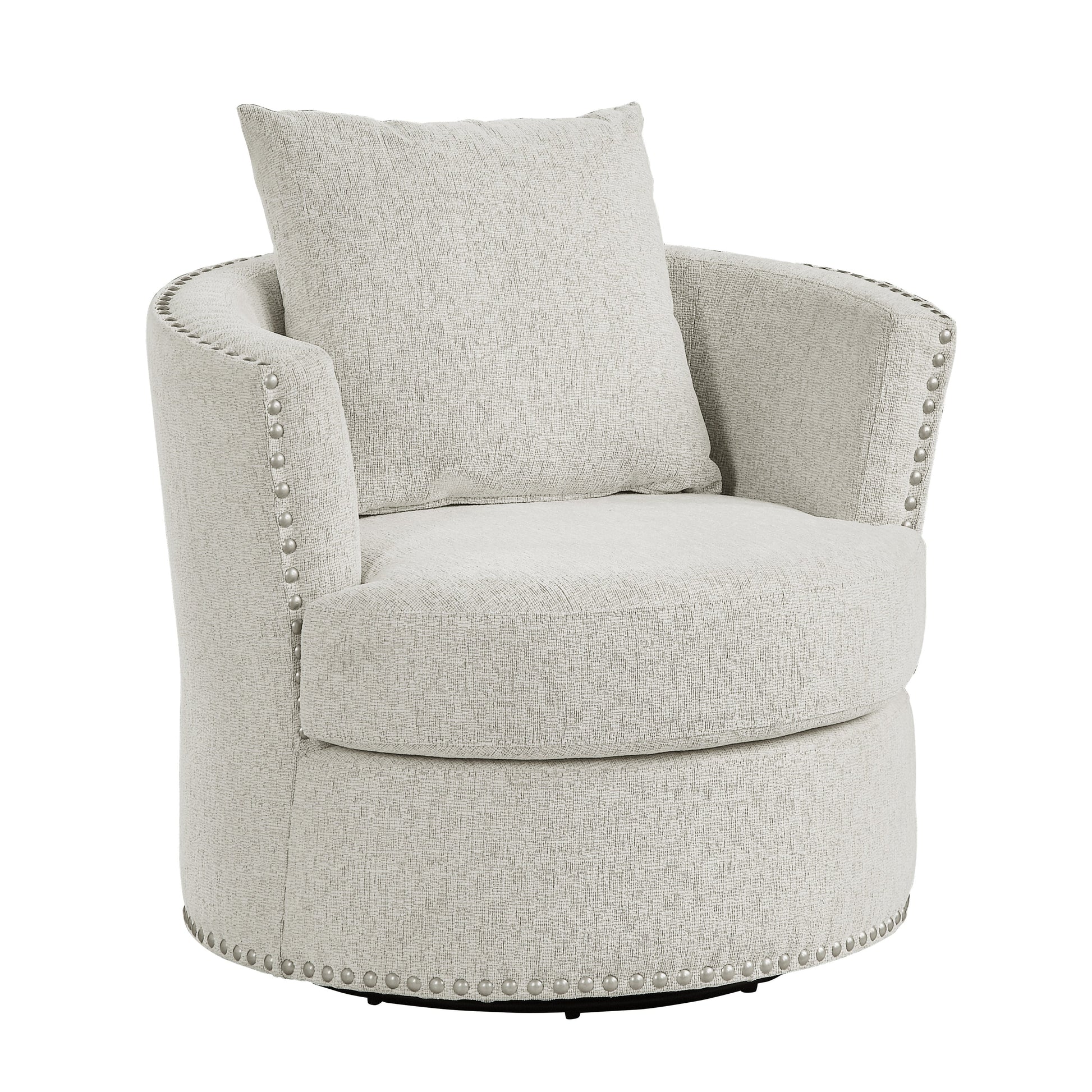 A perfect addition to your casual living room, the Morelia Collection’s decoratively flexible style allows for placement in myriad living room settings. Covered in beige chenille, the profile of this swivel-base chair is defined by its nailhead trim, loose back cushions and track-style arms, creating a look that is perfect for your home’s living room.
