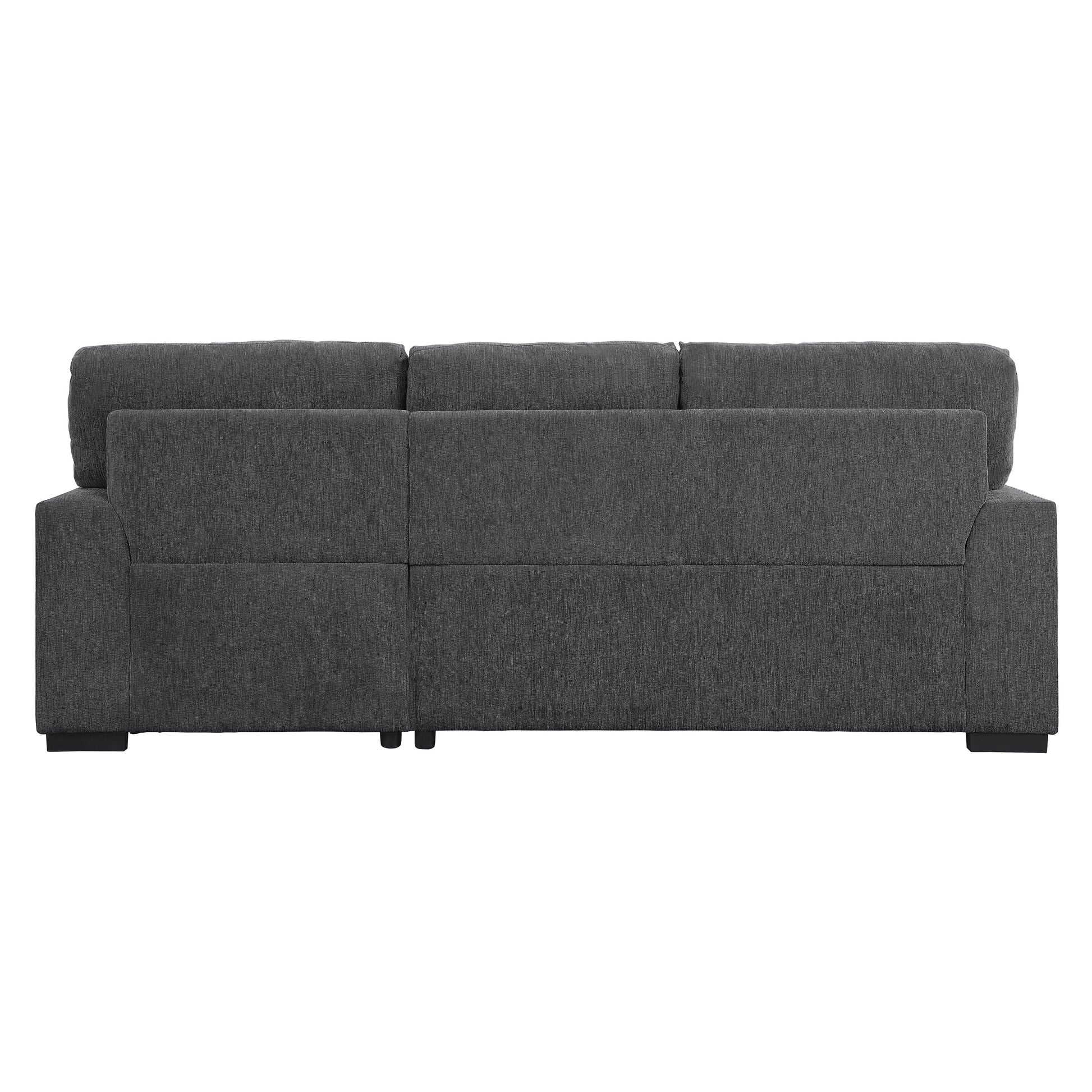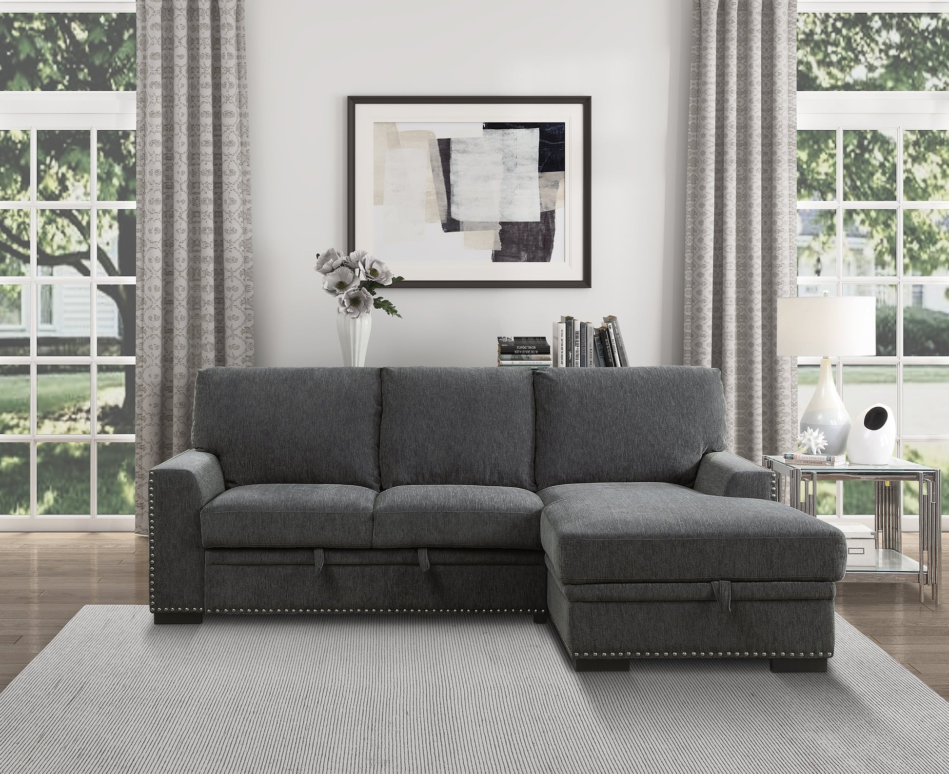 A perfect addition to your casual living room, the Morelia Collection’s functionality goes beyond that of a traditional sofa. Covered in charcoal-hued chenille, the modern profile of this seating group is defined by its nailhead trim, loose back cushions and track-style arms. Conveniently stored beneath the sofa is a pull-out trundle that rises to create a bed while the top of the attached chaise opens to reveal under-seat storage. The right side chaise and paired two-seater create a configuration perfect for your living room's available space.A coordinating swivel chair lends complementing decorative accent with its barrel shape and loose back cushion.
