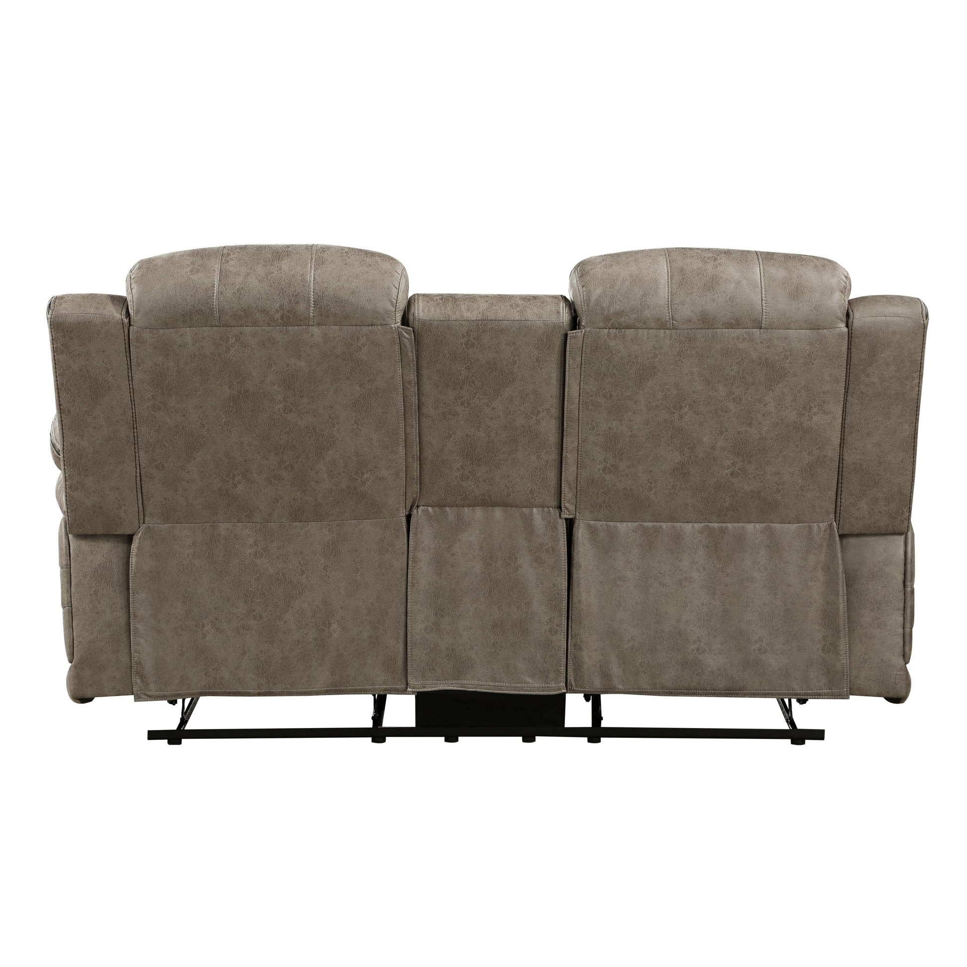 The design of the Centeroak Collection provides a platform for your relaxing downtime. From the classic transitional style to the versatile neutral color of the sandy brown polished microfiber fabric covering, this love seat is the perfect addition to your living room. Plush seating features vertical tufting, pillow-top arms, enhanced by the dual end recliners of the love seat. Creating additional function is the center console providing secure placement of beverages and lift top hidden storage. The reclining mechanism is engaged with a pull of the side mounted tabs, taking you from seated to prone in an easy motion.
