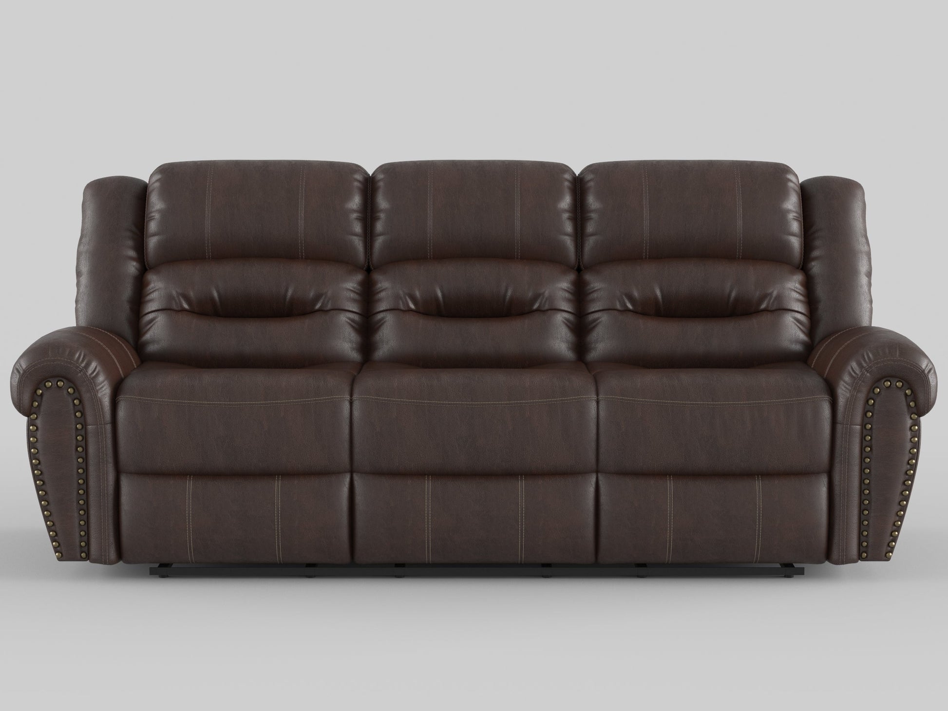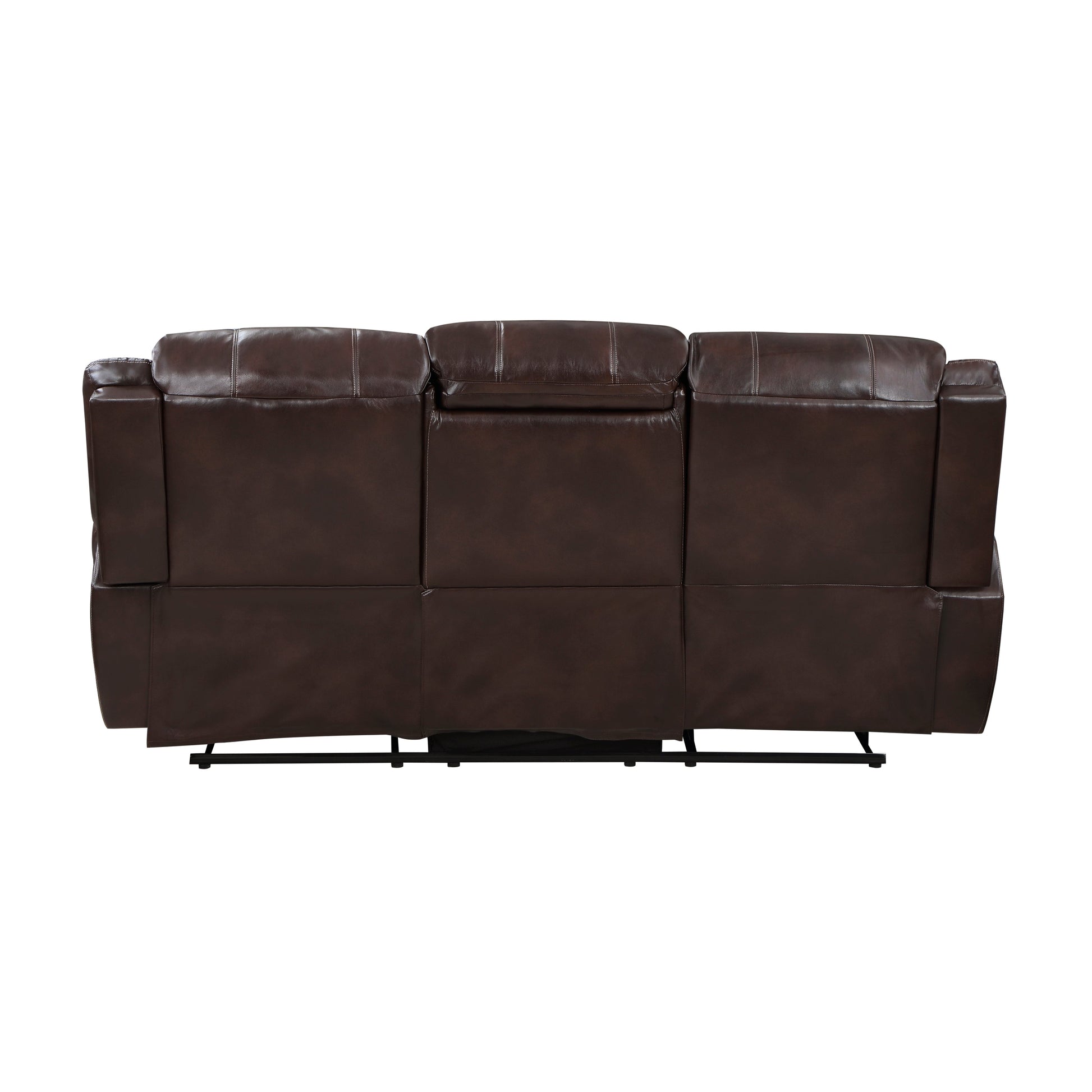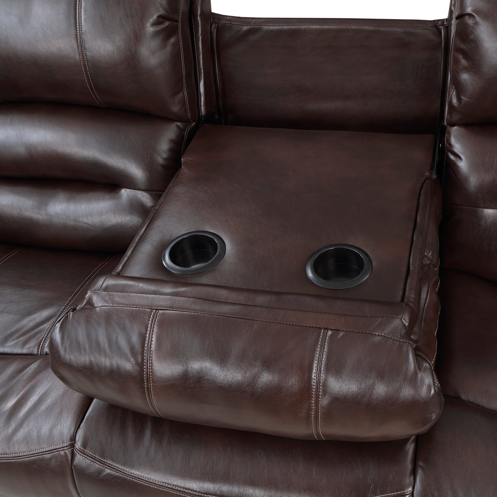 With plush seating that is uncommon in most traditional looks, the design of Center Hill Collection will be a welcome addition to your living room. The traditional nailhead accent lends an elegant statement to the sofa and the easy recline mechanism adds to the comfort. Furthering the convenient design of the collection, the sofa features a drop-down center seat back with cupholders. This lovely seating offering will provide your friends and family a warm environment to spend their quality moments. The sofa is offered in brown premium faux leather with manual reclining mechanism.