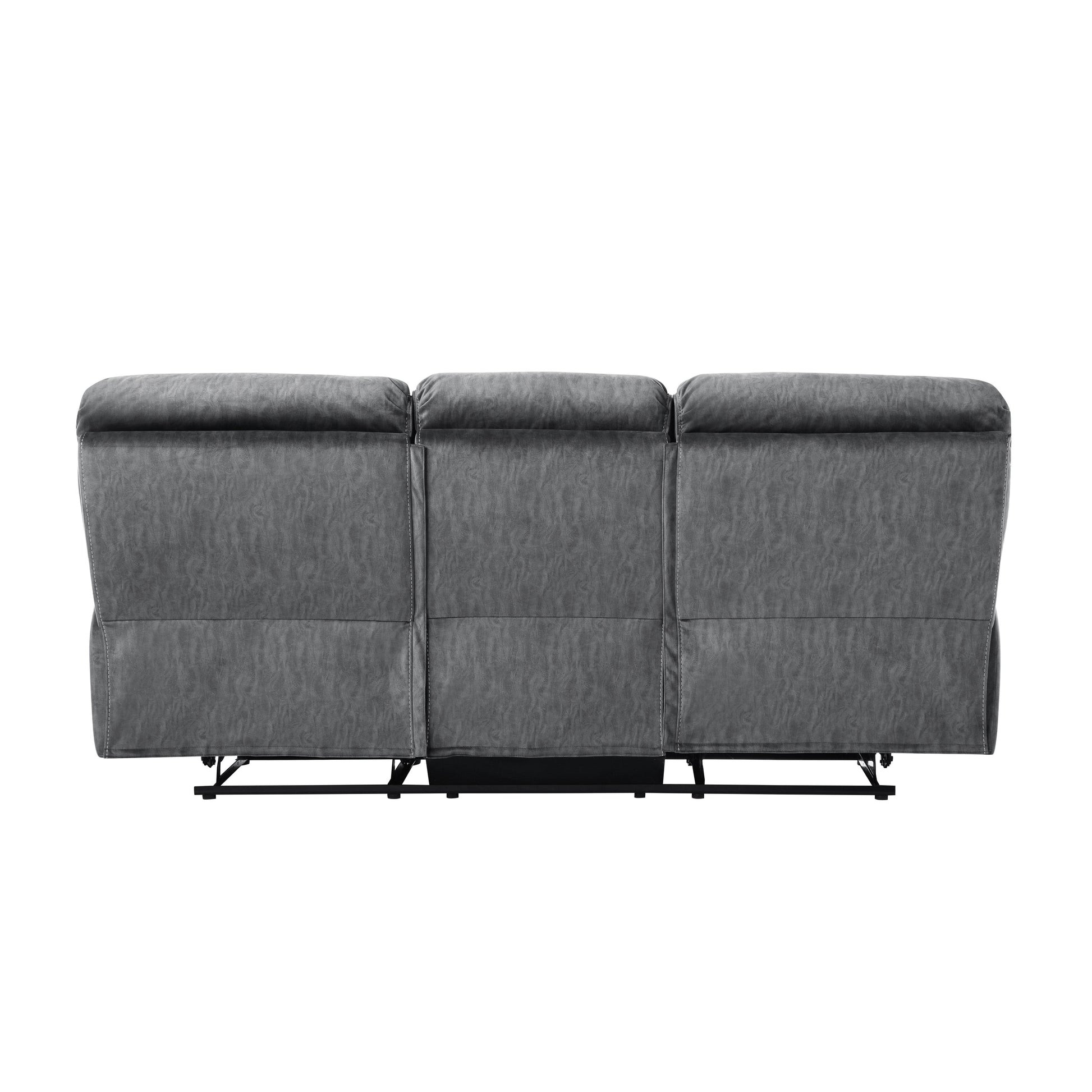 With a versatile style that is perfect for your casual living room, the Muirfield Collection’s plush seating and modern aesthetic create a platform for your relaxation. The plush pillow-top arms and seating of the sofa are covered in gray textured microfiber upholstery for neutral accent to your home’s decor. The manual reclining mechanism operates with the pull of a side-mounted tab, that once engaged, take you from seated to reclined in an easy motion.